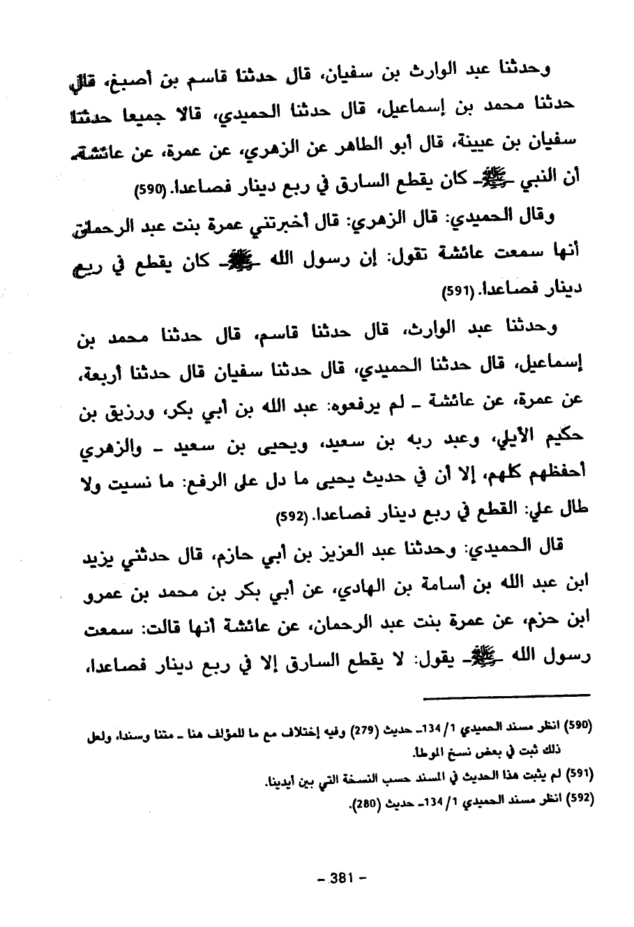 قال الحميدي وَحَدَّثَنَا عَبْدُ الْعَزِيزِ بْنُ أَبِي حَازِمٍ قَالَ حَدَّثَنِي يَزِيدَ بْنِ عَبْدِ اللَّهِ بْنِ أُسَامَةَ بْنِ الهادي عَنْ أَبِي بَكْرِ بْنِ مُحَمَّدِ بْنِ عَمْرِو ابن حَزْمٍ عَنْ عَمْرَةَ بِنْتِ عَبْدِ الرَّحْمَنِ عَنْ عَائِشَةَ أَنَّهَا قَالَتْ سَمِعْتُ رَسُولَ اللَّهِ صَلَّى اللَّهُ عَلَيْهِ وَسَلَّمَ يَقُولُ لَا يُقْطَعُ السَّارِقُ إِلَّا فِي رُبْعِ دِينَارٍ فَصَاعِدًا