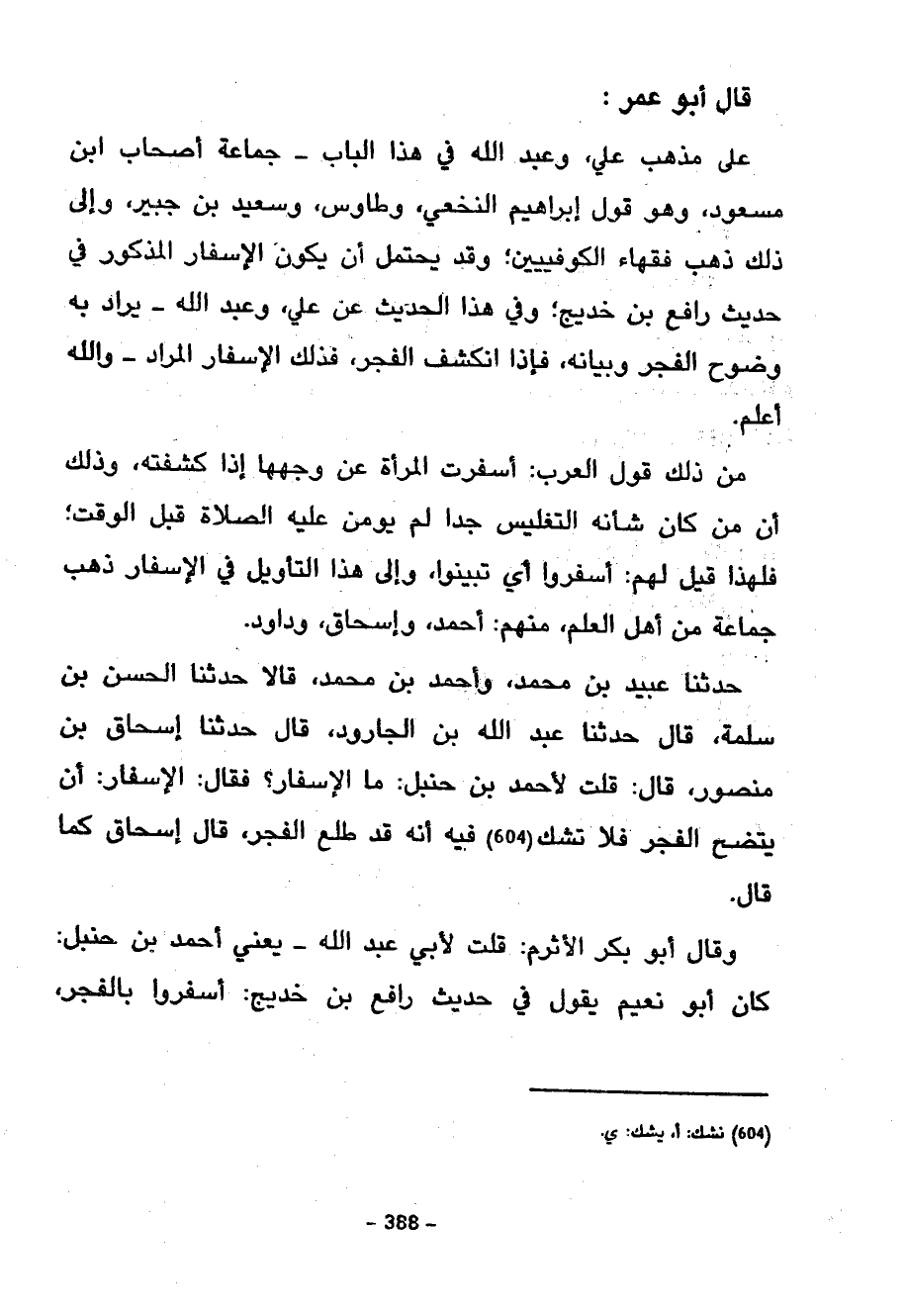 حَدَّثَنَا عُبَيْدُ بْنُ مُحَمَّدٍ وَأَحْمَدُ بْنُ مُحَمَّدٍ قَالَا حَدَّثَنَا الْحَسَنُ بْنُ سَلَمَةَ قَالَ حَدَّثَنَا عَبْدُ اللَّهِ بْنُ الْجَارُودِ قَالَ حَدَّثَنَا إِسْحَاقُ بْنُ مَنْصُورٍ قَالَ قُلْتُ لِأَحْمَدَ بْنِ حَنْبَلٍ مَا الْإِسْفَارُ فَقَالَ الْإِسْفَارُ أَنْ يَتَّضِحَ الْفَجْرُ فَلَا تَشُكُّ فِيهِ أَنَّهُ قَدْ طَلَعَ الْفَجْرُ قَالَ إِسْحَاقُ كَمَا قَالَ