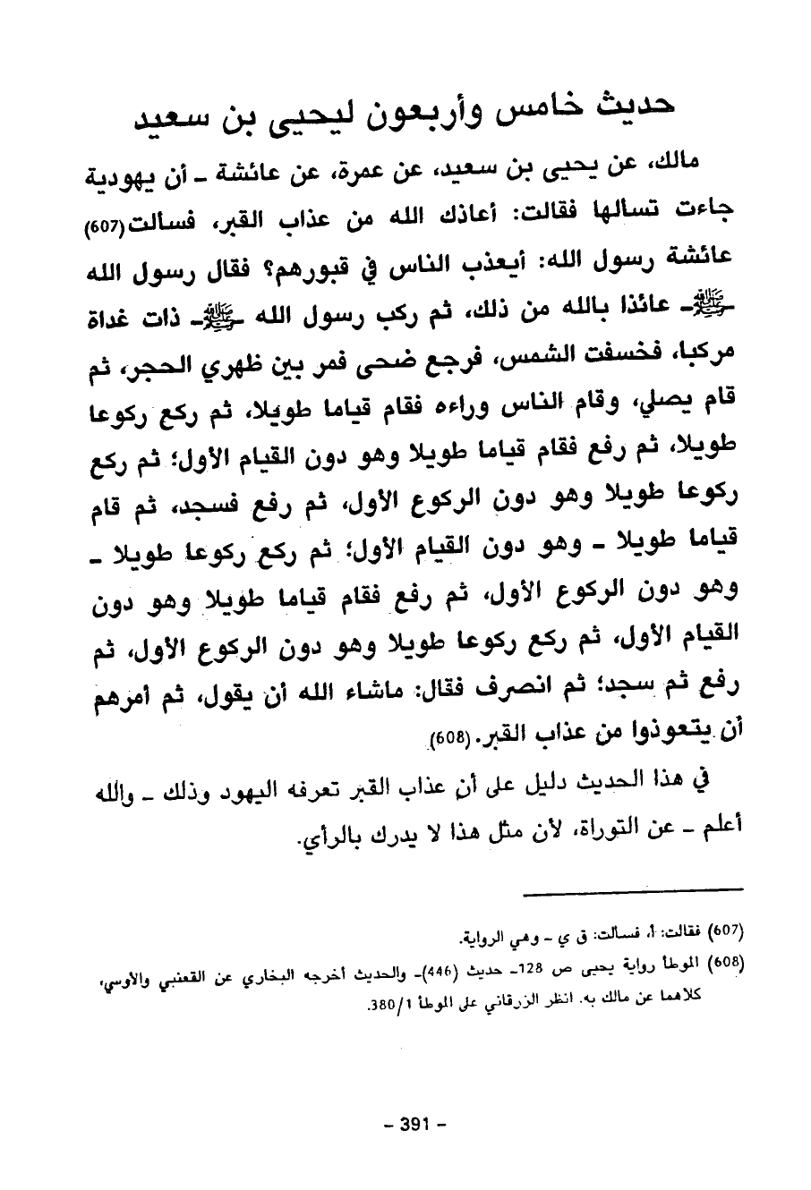 847 - مَالِكٍ عَنْ يَحْيَى بْنِ سَعِيدٍ عَنْ عَمْرَةَ عَنْ عَائِشَةَ أَنَّ يَهُودِيَّةً جَاءَتْ تَسْأَلُهَا فَقَالَتْ أَعَاذَكِ اللَّهُ مِنْ عَذَابِ الْقَبْرِ فَسَأَلَتْ عَائِشَةَ رَسُولَ اللَّهِ صَلَّى اللَّهُ عَلَيْهِ وَسَلَّمَ أَيُعَذَّبُ النَّاسُ فِي قُبُورِهِمْ فَقَالَ رَسُولُ اللَّهِ صَلَّى اللَّهُ عَلَيْهِ وَسَلَّمَ عَائِذًا بِاللَّهِ مِنْ ذَلِكَ ثُمَّ رَكِبَ رَسُولُ اللَّهِ صَلَّى اللَّهُ عَلَيْهِ وَسَلَّمَ ذَاتَ غَدَاةٍ مَرْكَبًا فَخَسَفَتِ الشَّمْسُ فَرَجَعَ ضُحًى فَمَرَّ بَيْنَ ظَهْرَيِ الْحُجَرِ ثُمَّ قَامَ يُصَلِّي وَقَامَ النَّاسُ وَرَاءَهُ فَقَامَ قِيَامًا طَوِيلًا ثُمَّ رَكَعَ رُكُوعًا طَوِيلًا ثُمَّ رَفَعَ فَقَامَ قِيَامًا طَوِيلًا وَهُوَ دُونَ الْقِيَامِ الْأَوَّلِ ثُمَّ رَكَعَ رُكُوعًا طَوِيلًا وَهُوَ دُونَ الرُّكُوعِ الْأَوَّلِ ثُمَّ رَفَعَ فَسَجَدَ ثُمَّ قَامَ قِيَامًا طَوِيلًا وَهُوَ دُونَ الْقِيَامِ الْأَوَّلِ ثُمَّ رَكَعَ رُكُوعًا طَوِيلًا وَهُوَ دُونَ الرُّكُوعِ الْأَوَّلِ ثُمَّ رَفَعَ فَقَامَ قِيَامًا طَوِيلًا وَهُوَ دُونَ الْقِيَامِ الْأَوَّلِ ثُمَّ رَكَعَ رُكُوعًا طَوِيلًا وَهُوَ دُونَ الرُّكُوعِ الْأَوَّلِ ثُمَّ رَفَعَ ثُمَّ سَجَدَ ثُمَّ انْصَرَفَ فَقَالَ مَا شَاءَ اللَّهُ أَنْ يَقُولَ ثُمَّ أَمَرَهُمْ أَنْ يَتَعَوَّذُوا مِنْ عَذَابِ الْقَبْرِ