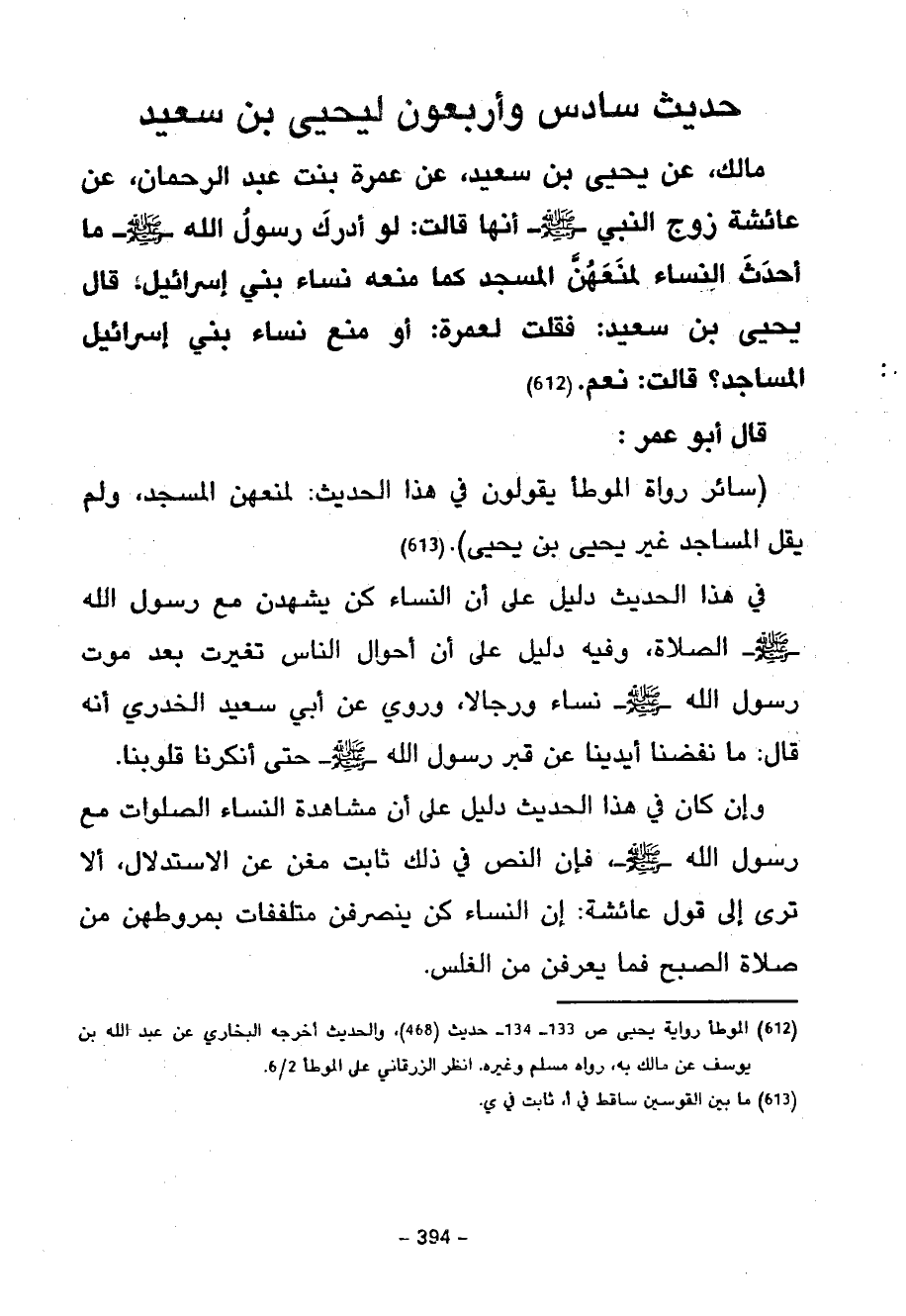 قَالَ أَبُو عُمَرَ سَائِرُ رُوَاةِ الْمُوَطَّأِ يَقُولُونَ فِي هَذَا الْحَدِيثِ لَمَنَعَهُنَّ الْمَسْجِدَ وَلَمْ يَقُلِ الْمَسَاجِدَ غَيْر يَحْيَى بْنِ يَحْيَى
