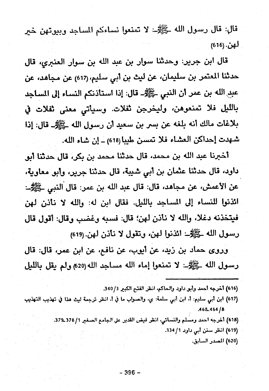 قَالَ ابْنُ جَرِيرٍ وَحَدَّثَنَا سَوَّارُ بْنُ عَبْدِ اللَّهِ بْنِ سَوَّارٍ الْعَنْبَرِيُّ قَالَ حَدَّثَنَا الْمُعْتَمِرُ بْنُ سُلَيْمَانَ عَنْ لَيْثِ بْنِ أَبِي سُلَيْمٍ عَنْ مُجَاهِدٍ عَنْ عَبْدِ اللَّهِ بْنِ عُمَرَ أَنَّ النَّبِيَّ صَلَّى اللَّهُ عَلَيْهِ وَسَلَّمَ قَالَ إِذَا اسْتَأْذَنَكُمُ النِّسَاءُ إِلَى الْمَسَاجِدِ بِاللَّيْلِ فَلَا تَمْنَعُوهُنَّ وَلْيَخْرُجْنَ ثَفِلَاتٍ