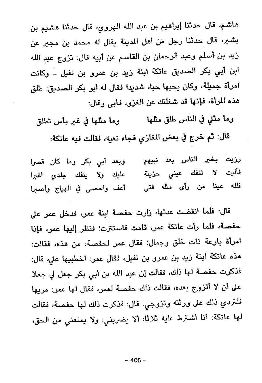 هَاشِمٍ قَالَ حَدَّثَنَا إِبْرَاهِيمُ بْنُ عَبْدِ اللَّهِ الْهَرَوِيُّ قَالَ حَدَّثَنَا هُشَيْمُ بْنُ بَشِيرٍ قَالَ حَدَّثَنَا رَجُلٌ مِنْ أَهْلِ الْمَدِينَةِ يُقَالُ لَهُ مُحَمَّدُ بْنُ مُجَبَّرٍ عَنْ زَيْدِ بْنِ أَسْلَمَ وَعَبْدِ الرَّحْمَنِ بْنِ الْقَاسِمِ عَنْ أَبِيهِ قَالَ تَزَوَّجَ عَبْدُ اللَّهِ بْنُ أَبِي بَكْرٍ الصِّدِّيقِ عاتكة ابنة زيد بن عمرو بن نفيل وَكَانَتِ امْرَأَةً جَمِيلَةً وَكَانَ يُحِبُّهَا حُبًّا شَدِيدًا فَقَالَ لَهُ أَبُو بَكْرٍ الصِّدِّيقُ طَلِّقْ هَذِهِ الْمَرْأَةَ فَإِنَّهَا قَدْ شَغَلَتْكَ عَنِ الْغَزْوِ فَأَبَى وَقَالَ وَمَنْ مِثْلِي فِي النَّاسِ طَلَّقَ مِثْلَهَا وَمَا مِثْلُهَا فِي غَيْرِ بَأْسٍ تُطَلَّقُ قَالَ ثُمَّ خَرَجَ فِي بَعْضِ الْمَغَازِي فَجَاءَ نَعْيُهُ فَقَالَتْ فِيهِ عَاتِكَةُ رُزِيتُ بِخَيْرِ النَّاسِ بَعْدَ نَبِيِّهِمْ وَبَعْدَ أَبِي بَكْرٍ وَمَا كَانَ قَصَّرَا فَآلَيْتُ لَا تَنْفَكُّ عَيْنَيْ حَزِينَةً عَلَيْكَ وَلَا يَنْفَكُّ جِلْدِي أَغْبَرَا فَلِلَّهِ عَيْنَا مَنْ رَأَى مِثْلَهُ فَتًى أَعَفَّ وَأَحْصَى فِي الْهَيَاجِ وَأَصْبَرَا قَالَ فَلَمَّا انْقَضَتْ عِدَّتُهَا زَارَتْ حَفْصَةَ ابْنَةَ عُمَرَ فَدَخَلَ عُمَرُ عَلَى حَفْصَةَ فَلَمَّا رَأَتْ عَاتِكَةُ عُمَرَ قَامَتْ فَاسْتَتَرَتْ فَنَظَرَ إِلَيْهَا عُمَرُ فَإِذَا امْرَأَةٌ بَارِعَةٌ ذَاتُ خُلُقٍ وَجَمَالٍ فَقَالَ عُمَرُ لِحَفْصَةَ مَنْ هَذِهِ فَقَالَتْ هَذِهِ عَاتِكَةُ ابنة زيد عَمْرِو بْنِ نُفَيْلٍ فَقَالَ عُمَرُ اخْطُبِيهَا عَلَيَّ قَالَ فَذَكَرَتْ حَفْصَةُ لَهَا ذَلِكَ فَقَالَتْ إِنَّ عَبْدَ اللَّهِ بْنَ أَبِي بَكْرٍ جَعَلَ لِي جُعْلًا عَلَى أَنْ لَا أَتَزَوَّجَ بَعْدَهُ فَقَالَتْ ذَلِكَ حَفْصَةُ لِعُمَرَ فَقَالَ لَهَا عُمَرُ مُرِيهَا فَلْتَرُدِّي ذَلِكَ عَلَى وَرَثَتِهِ وَتَزَوَّجِي