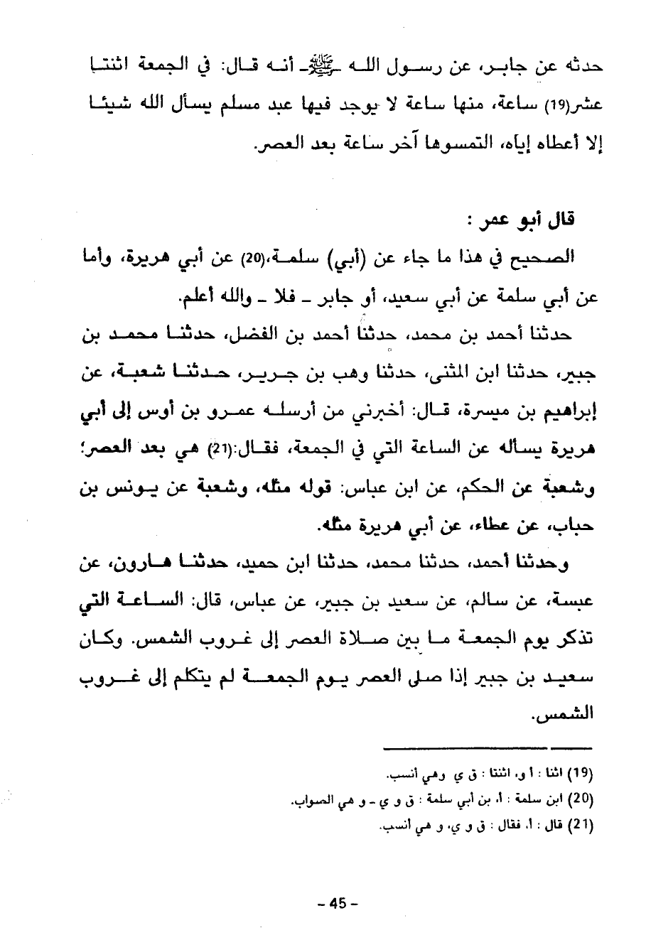 وَكَانَ سَعِيدُ بْنُ جُبَيْرٍ إِذَا صَلَّى الْعَصْرَ يَوْمَ الْجُمْعَةِ لَمْ يَتَكَلَّمْ إِلَى غُرُوبِ الشَّمْسِ