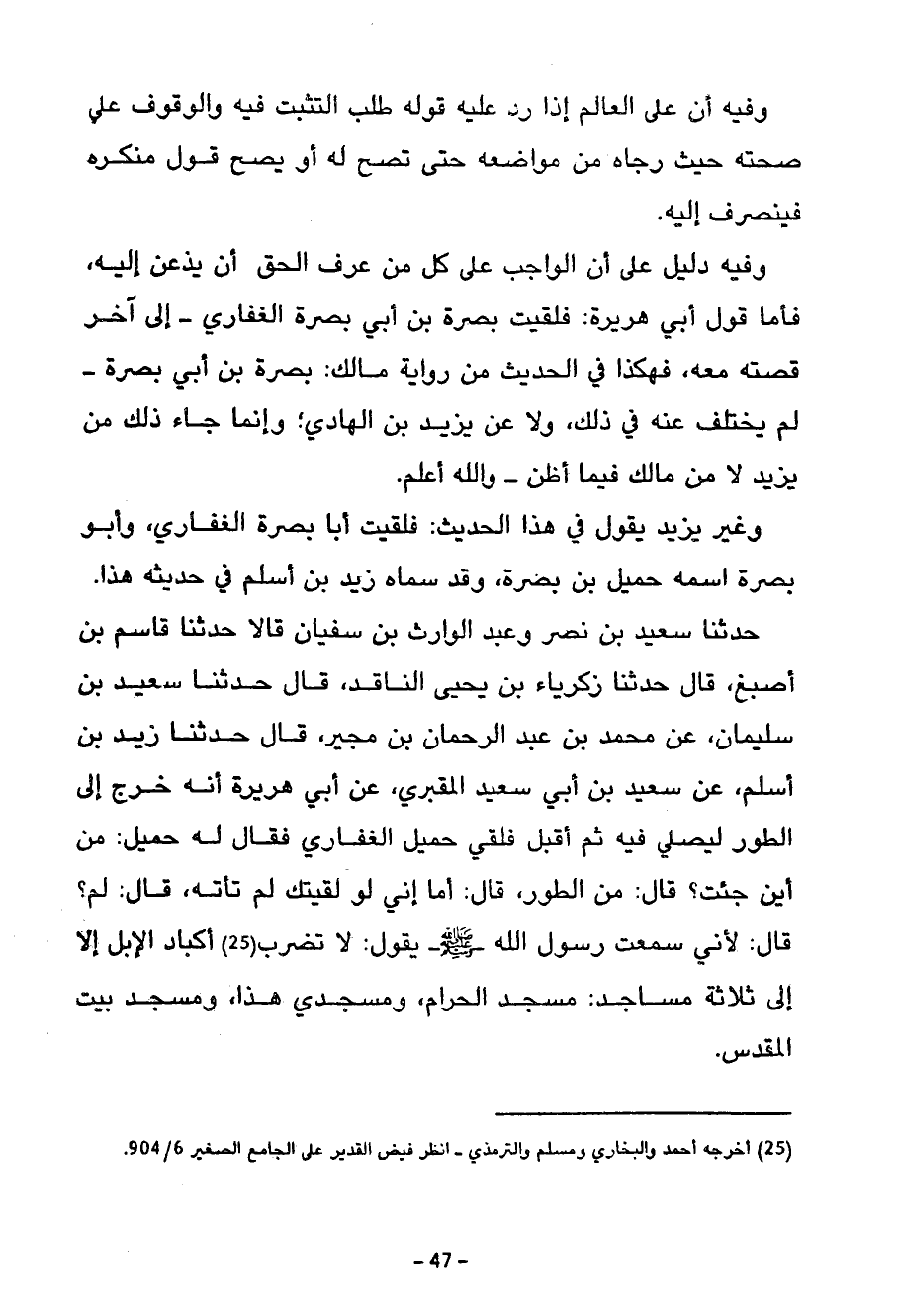 حَدَّثَنَا سَعِيدُ بْنُ نَصْرٍ وَعَبْدُ الْوَارِثِ بْنُ سُفْيَانَ قَالَا حَدَّثَنَا قَاسِمُ بْنُ أَصْبَغَ قَالَ حَدَّثَنَا زَكَرِيَّاءُ بْنُ يَحْيَى النَّاقِدُ قَالَ حَدَّثَنَا سَعِيدُ بْنُ سُلَيْمَانَ عَنْ مُحَمَّدِ بْنِ عَبْدِ الرَّحْمَنِ بْنِ مُجِيرٍ قَالَ حَدَّثَنَا زَيْدِ بْنِ أَسْلَمَ عَنْ سَعِيدِ بْنِ أَبِي سَعِيدٍ الْمَقْبُرِيِّ عَنْ أبي هُرَيْرَةَ أَنَّهُ خَرَجَ إِلَى الطُّورِ لِيُصَلِّيَ فِيهِ ثم أقبل فلقي حميل الْغِفَارِيَّ فَقَالَ لَهُ حُمَيْلٌ مِنْ أَيْنَ جِئْتَ قَالَ مِنَ الطُّورِ قَالَ أَمَا إِنِّي لَوْ لَقِيتُكَ لَمْ تَأْتِهِ قَالَ لِمَ قَالَ لِأَنِّي سمعت رسول الله يَقُولُ لَا تُضْرَبُ أَكْبَادُ الْإِبِلِ إِلَّا إِلَى ثَلَاثَةِ مَسَاجِدَ مَسْجِدِ الْحَرَامِ وَمَسْجِدِي هَذَا وَمَسْجِدِ بيت المقدس