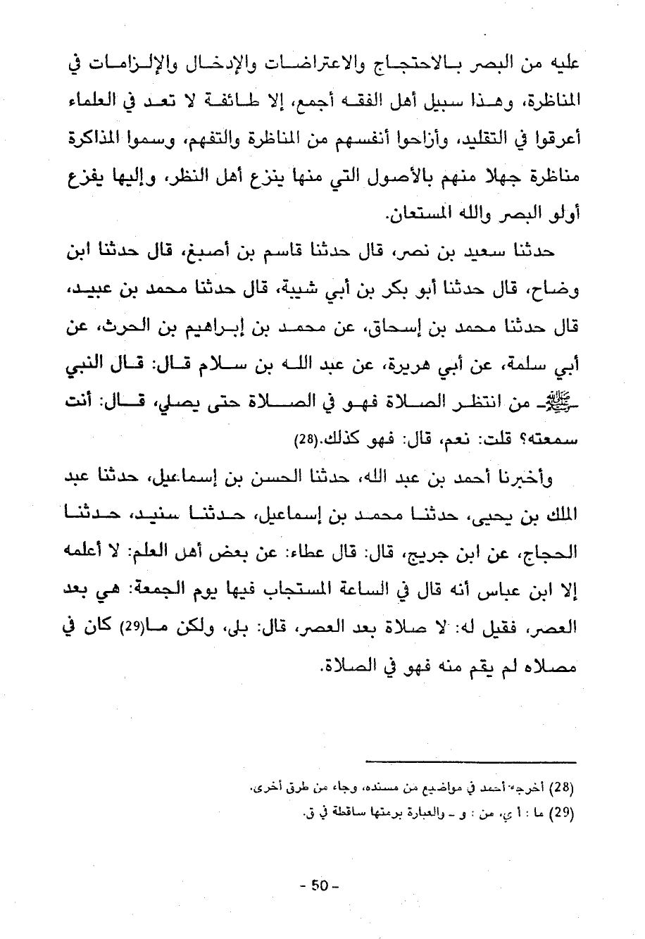 عَلَيْهِ مِنَ الْبَصَرِ بِالِاحْتِجَاجِ وَالِاعْتِرَاضَاتِ وَالْإِدْخَالِ وَالْإِلْزَامَاتِ فِي الْمُنَاظَرَةِ وَهَذَا سَبِيلُ أَهْلِ الْفِقْهِ أَجْمَعَ إِلَّا طَائِفَةً لَا تُعَدُّ مِنَ الْعُلَمَاءِ أَعْرَقُوا فِي التَّقْلِيدِ وَأَزَاحُوا أَنْفُسَهُمْ مِنَ الْمُنَاظَرَةِ وَالتَّفَهُّمِ وَسَمَّوُا الْمُذَاكَرَةَ مُنَاظَرَةً جَهْلًا مِنْهُمْ بِالْأُصُولِ الَّتِي منها ينزع أهل النظر وإليها يفزع أولوا الْبَصَرِ وَاللَّهُ الْمُسْتَعَانُ