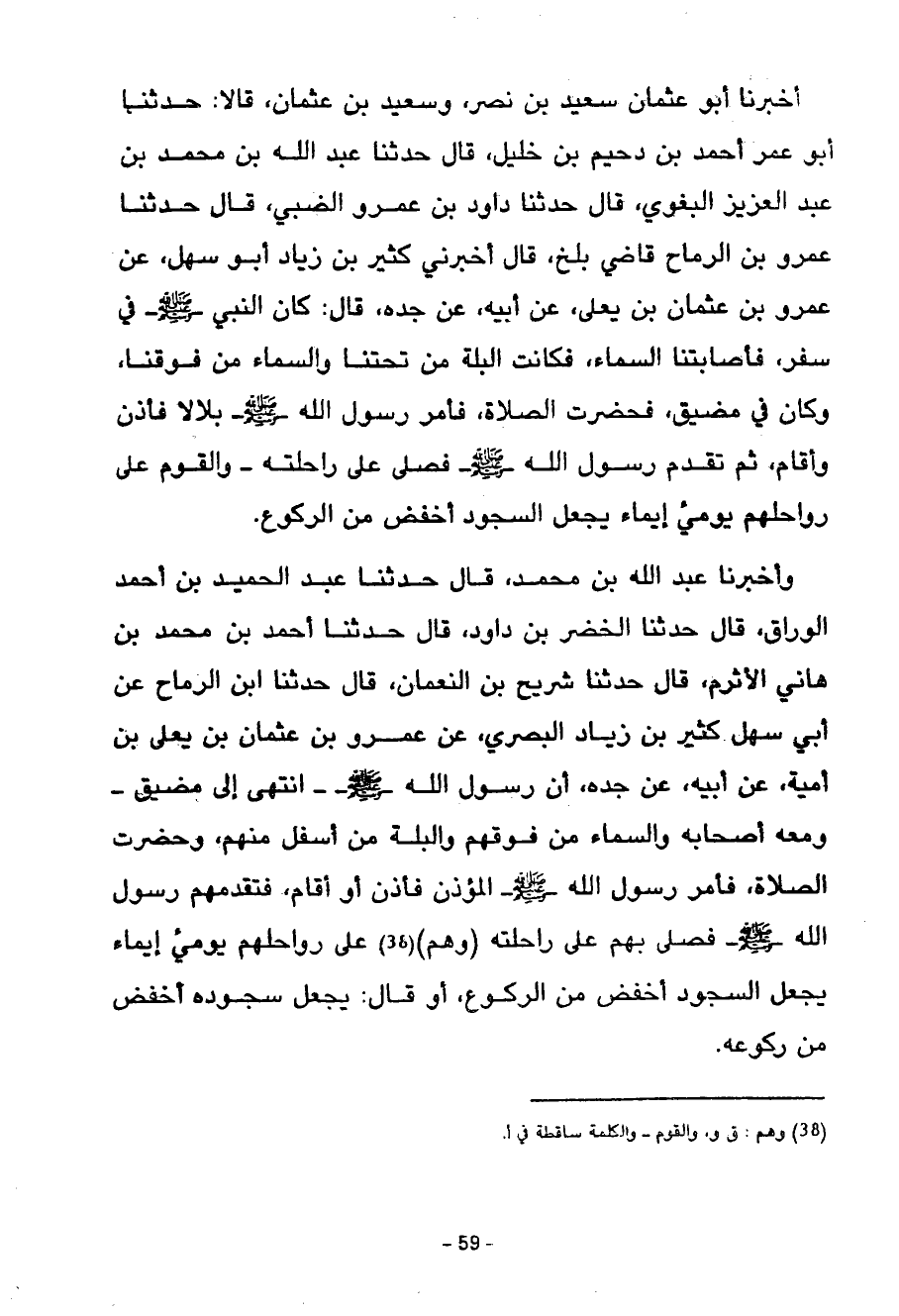 وَأَخْبَرَنَا عَبْدُ اللَّهِ بْنُ مُحَمَّدٍ قَالَ حَدَّثَنَا عَبْدُ الْحَمِيدِ بْنُ أَحْمَدَ الْوَارَّقُ قَالَ حَدَّثَنَا الْخَضِرُ بْنُ دَاوُدَ قَالَ حَدَّثَنَا أَحْمَدُ بْنُ مُحَمَّدِ بْنِ هَانِي الْأَثْرَمُ قَالَ حَدَّثَنَا شُرَيْحُ بْنُ النُّعْمَانِ قَالَ حَدَّثَنَا ابْنُ الرَّمَّاحِ عَنْ أَبِي سَهْلٍ كَثِيرِ بْنِ زِيَادٍ الْبَصْرِيِّ عَنْ عَمْرِو بْنِ عُثْمَانَ بْنِ يَعْلَى بْنِ أُمَيَّةَ عَنْ أَبِيهِ عَنِ جَدِّهِ أَنَّ رَسُولَ اللَّهِ انْتَهَى إِلَى مَضِيقٍ وَمَعَهُ أَصْحَابُهُ وَالسَّمَاءُ مِنْ فوقهم البلة مِنْ أَسْفَلَ مِنْهُمْ وَحَضَرَتِ الصَّلَاةُ فَأَمَرَ رَسُولُ الله الْمُؤَذِّنَ فَأَذَّنَ أَوْ أَقَامَ فَتَقَدَّمَهُمْ رَسُولُ اللَّهِ فَصَلَّى بِهِمْ عَلَى رَاحِلَتِهِ وَهُمْ عَلَى رَوَاحِلِهِمْ يوميء إِيمَاءً يَجْعَلُ السُّجُودَ أَخْفَضَ مِنَ الرُّكُوعِ أَوْ قَالَ يَجْعَلُ سُجُودَهُ أَخْفَضَ مِنْ رُكُوعِهِ