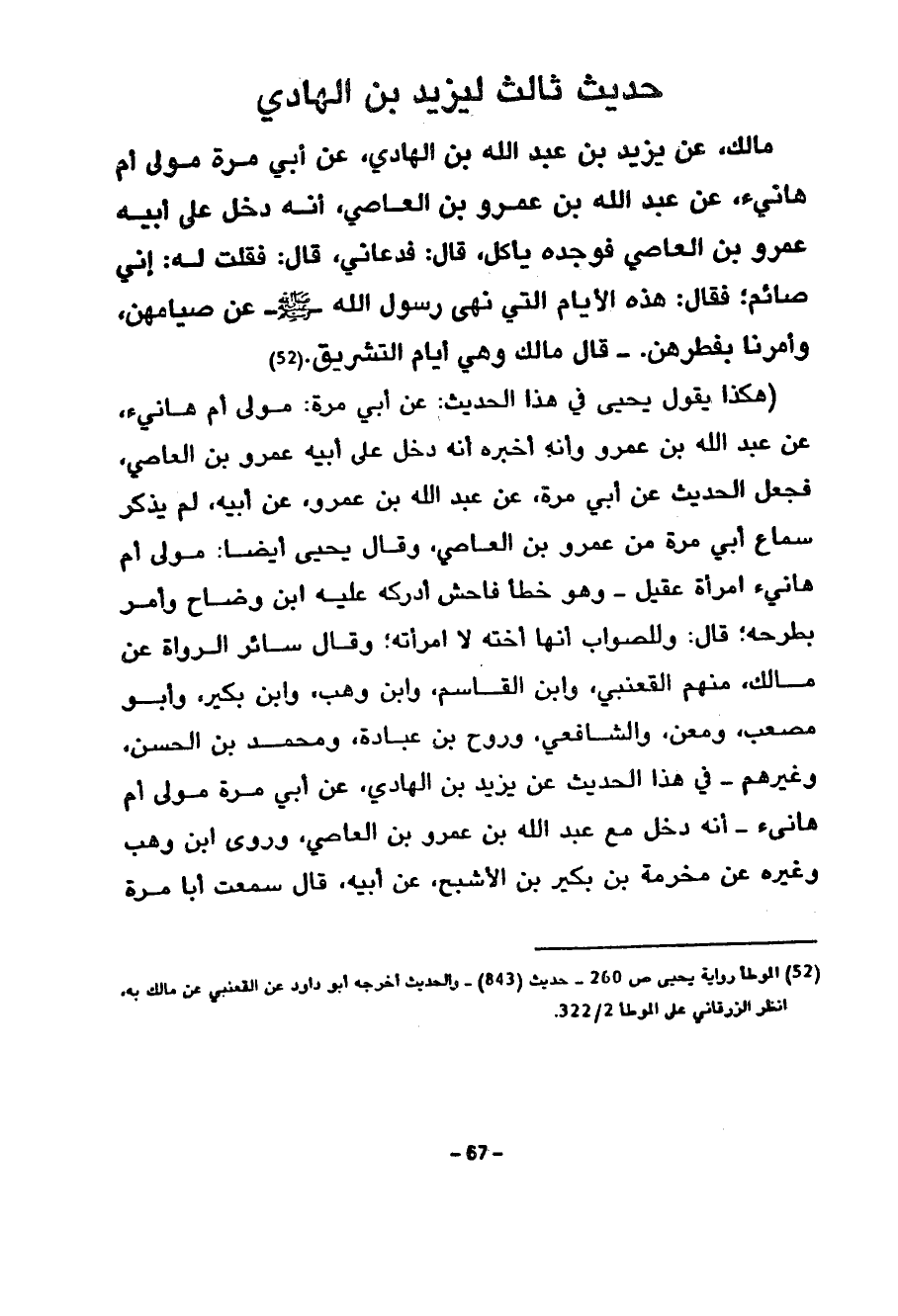 هَكَذَا يَقُولُ يَحْيَى فِي هَذَا الْحَدِيثِ عن أبي مرة مولى أم هانىء عَنْ عَبْدِ اللَّهِ بْنِ عَمْرٍو وَأَنَّهُ أَخْبَرَهُ أَنَّهُ دَخَلَ عَلَى أَبِيهِ عَمْرِو بْنِ الْعَاصِي فَجَعَلَ الْحَدِيثَ عَنْ أَبِي مُرَّةَ عَنْ عَبْدِ اللَّهِ بْنِ عَمْرٍو عَنْ أَبِيهِ لَمْ يَذْكُرْ سَمَاعَ أَبِي مُرَّةَ مِنْ عَمْرِو بْنِ الْعَاصِي وقال يحيى أيضا مولى أم هانىء امْرَأَةِ عَقِيلٍ وَهُوَ خَطَأٌ فَاحِشٌ أَدْرَكَهُ عَلَيْهِ ابْنُ وَضَّاحٍ وَأَمَرَ بِطَرْحِهِ قَالَ وَلِلصَّوَابِ أَنَّهَا أُخْتُهُ لَا امْرَأَتُهُ وَقَالَ سَائِرُ الرُّوَاةِ عَنْ مالك مِنْهُمْ الْقَعْنَبِيُّ وَابْنُ الْقَاسِمِ وَابْنُ وَهْبٍ وَابْنُ بكير وأبو مُصْعَبٍ وَمَعْنٍ وَالشَّافِعِيِّ وَرَوْحِ بْنِ عُبَادَةَ وَمُحَمَّدِ بْنِ الْحَسَنِ وَغَيْرِهِمْ فِي هَذَا الْحَدِيثِ عَنْ يَزِيدَ بْنِ الْهَادِي عَنْ أَبِي مُرَّةَ مَوْلَى أم هانىء أنه دخل مع عبد الله بن عمرو بْنِ الْعَاصِي وَرَوَى ابْنُ وَهْبٍ وَغَيْرُهُ عَنْ مخرمة بن بكير بن الأشبح عَنْ أَبِيهِ قَالَ سَمِعْتُ أَبَا مُرَّةَ