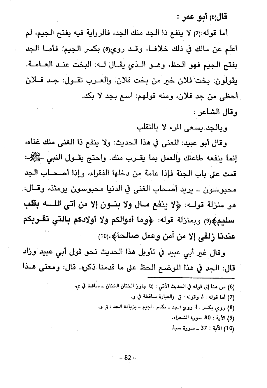 قَالَ أَبُو عُمَرَ أَمَّا قَوْلُهُ لَا يَنْفَعُ ذَا الْجَدِّ مِنْكَ الْجَدُّ فَالرِّوَايَةُ فِيهِ بِفَتْحِ الْجِيمِ لَمْ أَعْلَمْ عَنْ مَالِكٍ فِي ذَلِكَ خِلَافًا وَقَدْ رُوِيَ بِكَسْرِ الْجِيمِ فَأَمَّا الْجَدُّ بِفَتْحِ الْجِيمِ فَهُوَ الْحَظُّ وَهُوَ الَّذِي يُقَالُ لَهُ الْبَخْتُ عِنْدَ الْعَامَّةِ