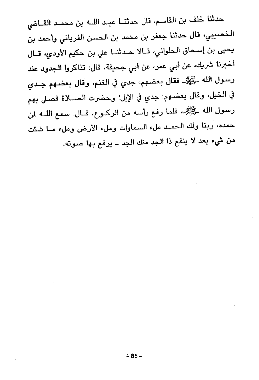 حَدَّثَنَا خَلَفُ بْنُ الْقَاسِمِ قَالَ حَدَّثَنَا عَبْدُ اللَّهِ بْنُ مُحَمَّدٍ الْقَاضِي الْخَصِيبِيُّ قَالَ حَدَّثَنَا جعفر بن محمد الغريابي وَأَحْمَدُ بْنُ يَحْيَى بْنِ إِسْحَاقَ الْحُلْوَانِيُّ قَالَا حَدَّثَنَا عَلِيُّ بْنُ حَكِيمٍ الْأَوْدِيُّ قَالَ أَخْبَرَنَا شَرِيكٌ عَنْ أَبِي عُمَرَ عَنْ أَبِي جُحَيْفَةَ قَالَ تَذَاكَرُوا الْجُدُودَ عِنْدَ رَسُولِ اللَّهِ صَلَّى اللَّهُ عَلَيْهِ وَسَلَّمَ فَقَالَ بَعْضُهُمْ جَدِّي فِي الْغَنَمِ وَقَالَ بَعْضُهُمْ جَدِّي فِي الْخَيْلِ وَقَالَ بعضهم جديث فِي الْإِبِلِ وَحَضَرَتِ الصَّلَاةُ فَصَلَّى بِهِمْ رَسُولُ اللَّهِ صَلَّى اللَّهُ عَلَيْهِ وَسَلَّمَ فَلَمَّا رَفَعَ رَأْسَهُ مِنَ الرُّكُوعِ قَالَ سَمِعَ اللَّهُ لِمَنْ حَمِدَهُ رَبَّنَا وَلَكَ الْحَمْدُ مِلْءَ السَّمَاوَاتِ وَمِلْءَ الْأَرْضِ وَمِلْءَ مَا شِئْتَ مِنْ شَيْءٍ بَعْدُ لَا يَنْفَعُ ذَا الْجَدِّ مِنْكَ الْجَدُّ يَرْفَعُ بها صوته