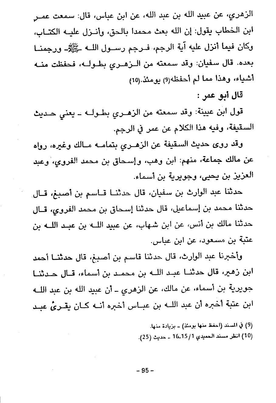 قَالَ أَبُو عُمَرَ قَوْلُ ابْنِ عُيَيْنَةَ وَقَدْ سَمِعْتُهُ مِنَ الزُّهْرِيِّ بِطُولِهِ يَعْنِي حَدِيثَ السَّقِيفَةِ وَفِيهِ هَذَا الْكَلَامُ عَنْ عُمَرَ فِي الرَّجْمِ