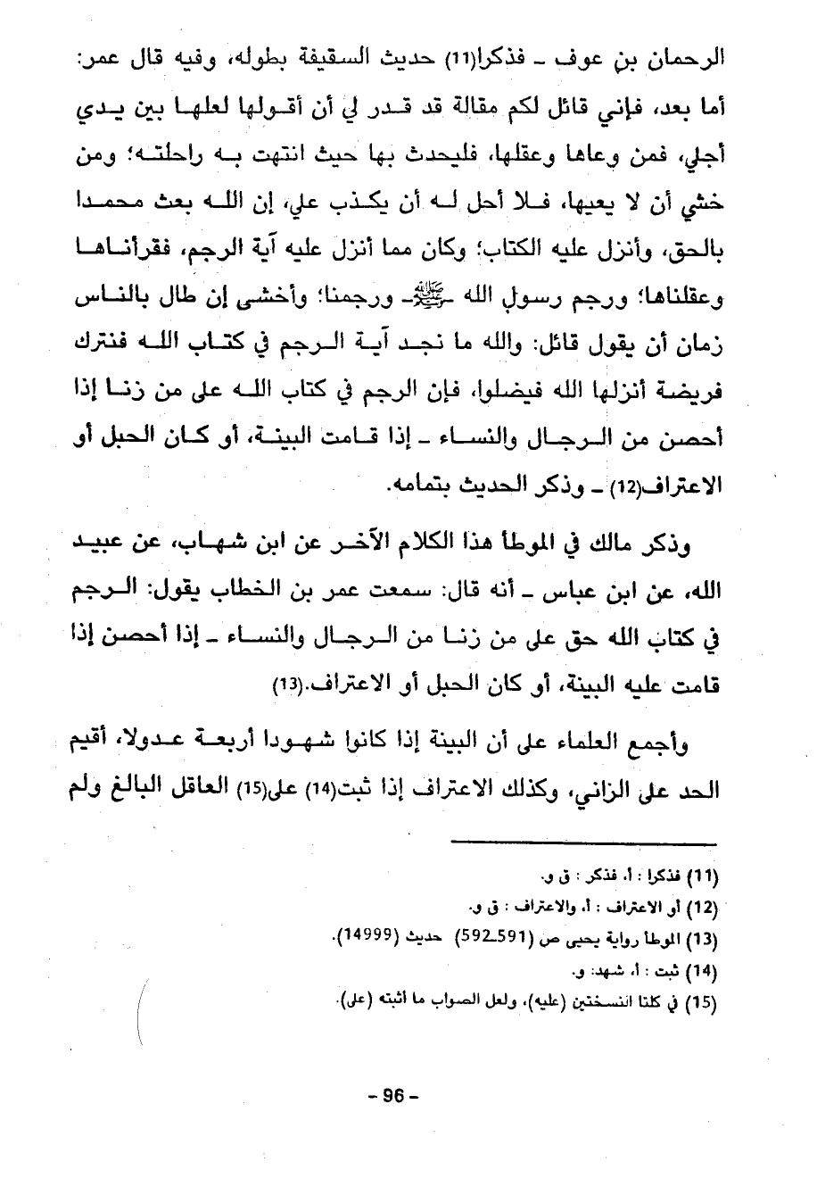 وَذَكَرَ مَالِكٌ فِي الْمُوَطَّأِ هَذَا الْكَلَامَ الْآخَرَ عَنِ ابْنِ شِهَابٍ عَنْ عُبَيْدِ اللَّهِ عَنِ ابْنِ عَبَّاسٍ أَنَّهُ قَالَ سَمِعْتُ عُمَرَ بْنَ الْخَطَّابِ يَقُولُ الرَّجْمُ فِي كِتَابِ اللَّهِ حَقٌّ عَلَى مَنْ زَنَا مِنَ الرِّجَالِ وَالنِّسَاءِ إِذَا أُحْصِنَ إِذَا قَامَتْ عَلَيْهِ الْبَيِّنَةُ أَوْ كَانَ الْحَبَلُ أَوِ الِاعْتِرَافُ