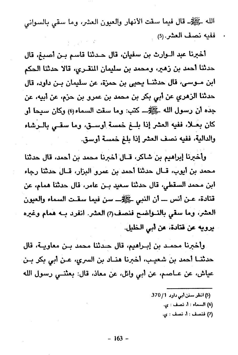 وَأَخْبَرَنَا إِبْرَاهِيمُ بْنُ شَاكِرٍ قَالَ أَخْبَرَنَا مُحَمَّدِ بْنِ أَحْمَدَ قَالَ حَدَّثَنَا مُحَمَّدُ بْنُ أَيُّوبَ قَالَ حَدَّثَنَا أَحْمَدُ بْنُ عَمْرٍو الْبَزَّارُ قَالَ حدثنا رجاء ابن مُحَمَّدٍ السَّقْطِيُّ قَالَ حَدَّثَنَا سَعِيدُ بْنُ عَامِرٍ قَالَ حَدَّثَنَا هَمَّامٌ عَنْ قَتَادَةَ عَنْ أَنَسِ أَنَّ النَّبِيَّ صَلَّى اللَّهُ عليه وسلم سنه فِيمَا سَقَتِ السَّمَاءُ وَالْعُيُونُ الْعُشْرُ وَمَا سُقِيَ بِالنَّوَاضِحِ فَنِصْفُ الْعُشْرِ