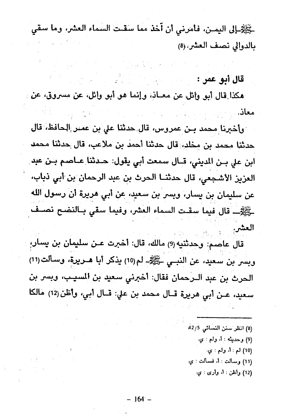 وَأَخْبَرَنَا مُحَمَّدُ بْنُ عَمْرُوسٍ قَالَ حَدَّثَنَا عَلِيُّ بْنُ عُمَرَ الْحَافِظُ قَالَ حَدَّثَنَا مُحَمَّدُ بْنُ مَخْلَدٍ قَالَ حَدَّثَنَا أَحْمَدُ بْنُ ملاعب قال حدثنا ابن عَلِيِّ بْنِ الْمَدِينِيِّ قَالَ سَمِعْتُ أَبِي يَقُولُ حَدَّثَنَا عَاصِمُ بْنُ عَبْدِ الْعَزِيزِ الْأَشْجَعِيُّ قَالَ حدثنا الحرث بْنِ عَبْدِ الرَّحْمَنِ بْنِ أَبِي ذُبَابٍ عَنْ سليمان بن يسار وبسر بن سَعِيدٍ عَنْ أَبِي هُرَيْرَةَ أَنَّ رَسُولَ اللَّهِ صَلَّى اللَّهُ عَلَيْهِ وَسَلَّمَ قَالَ فِيمَا سَقَتِ السَّمَاءُ الْعُشْرُ وَفِيمَا سُقِيَ بِالنَّضْحِ نِصْفُ الْعَشْرِ