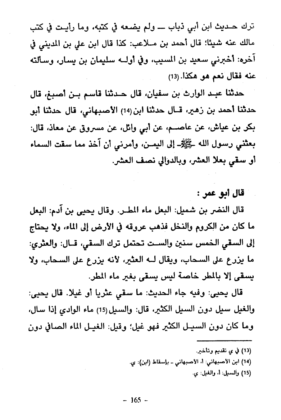 حَدَّثَنَا عَبْدُ الْوَارِثِ بْنُ سُفْيَانَ قَالَ حَدَّثَنَا قَاسِمُ بْنُ أَصْبَغَ قَالَ حَدَّثَنَا أَحْمَدُ بْنُ زُهَيْرٍ قَالَ حَدَّثَنَا ابْنُ الْأَصْبَهَانِيِّ قَالَ حَدَّثَنَا أَبُو بَكْرِ بْنُ عَيَّاشٍ عَنْ عَاصِمٍ عَنْ أَبِي وَائِلٍ عَنْ مَسْرُوقٍ عَنْ مُعَاذٍ قَالَ بَعَثَنِي رَسُولُ اللَّهِ صَلَّى اللَّهُ عَلَيْهِ وَسَلَّمَ إِلَى الْيَمَنِ وَأَمَرَنِي أَنْ آخُذَ مِمَّا سَقَتِ السَّمَاءُ أَوْ سُقِيَ بَعْلًا الْعُشْرَ وَبِالدَّوَالِي نِصْفَ الْعُشْرِ