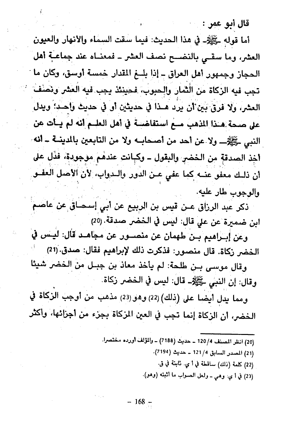 قَالَ أَبُو عُمَرَ أَمَّا قَوْلُهُ صَلَّى اللَّهُ عَلَيْهِ وَسَلَّمَ فِي هَذَا الْحَدِيثِ فِيمَا سَقَتِ السماء والأنهار والعيون العشر وما سقي النضح نِصْفُ الْعُشْرِ فَمَعْنَاهُ عِنْدَ جَمَاعَةِ أَهْلِ الْحِجَازِ وَجُمْهُورِ أَهْلِ الْعِرَاقِ إِذَا بَلَغَ الْمِقْدَارُ خَمْسَةَ أَوْسُقٍ وَكَانَ مَا تَجِبُ فِيهِ الزَّكَاةُ مِنَ الثِّمَارِ وَالْحُبُوبِ فَحِينَئِذٍ يَجِبُ فِيهِ الْعُشْرُ وَنِصْفُ الْعُشْرِ وَلَا فَرْقَ بَيْنَ أَنْ يَرِدَ هَذَا فِي حَدِيثَيْنِ أَوْ فِي حَدِيثٍ وَاحِدٍ وَيَدُلُّ عَلَى صِحَّةِ هَذَا الْمَذْهَبِ مَعَ اسْتِفَاضَةٍ فِي أَهْلِ الْعِلْمِ أَنَّهُ لَمْ يَأْتِ عَنِ النَّبِيِّ صَلَّى اللَّهُ عَلَيْهِ وَسَلَّمَ وَلَا عَنْ أَحَدٍ مِنْ أَصْحَابِهِ وَلَا مِنَ التَّابِعِينَ بِالْمَدِينَةِ أَنَّهُ أَخَذَ الصَّدَقَةَ مِنَ الْخُضَرِ وَالْبُقُولِ وَكَانَتْ عِنْدَهُمْ مَوْجُودَةً فَدَلَّ عَلَى أَنَّ ذَلِكَ مَعْفُوٌّ عَنْهُ كَمَا عُفِيَ عَنِ الدُّورِ وَالدَّوَابِّ لِأَنَّ الْأَصْلَ الْعَفْوُ وَالْوُجُوبُ طَارٌّ عَلَيْهِ