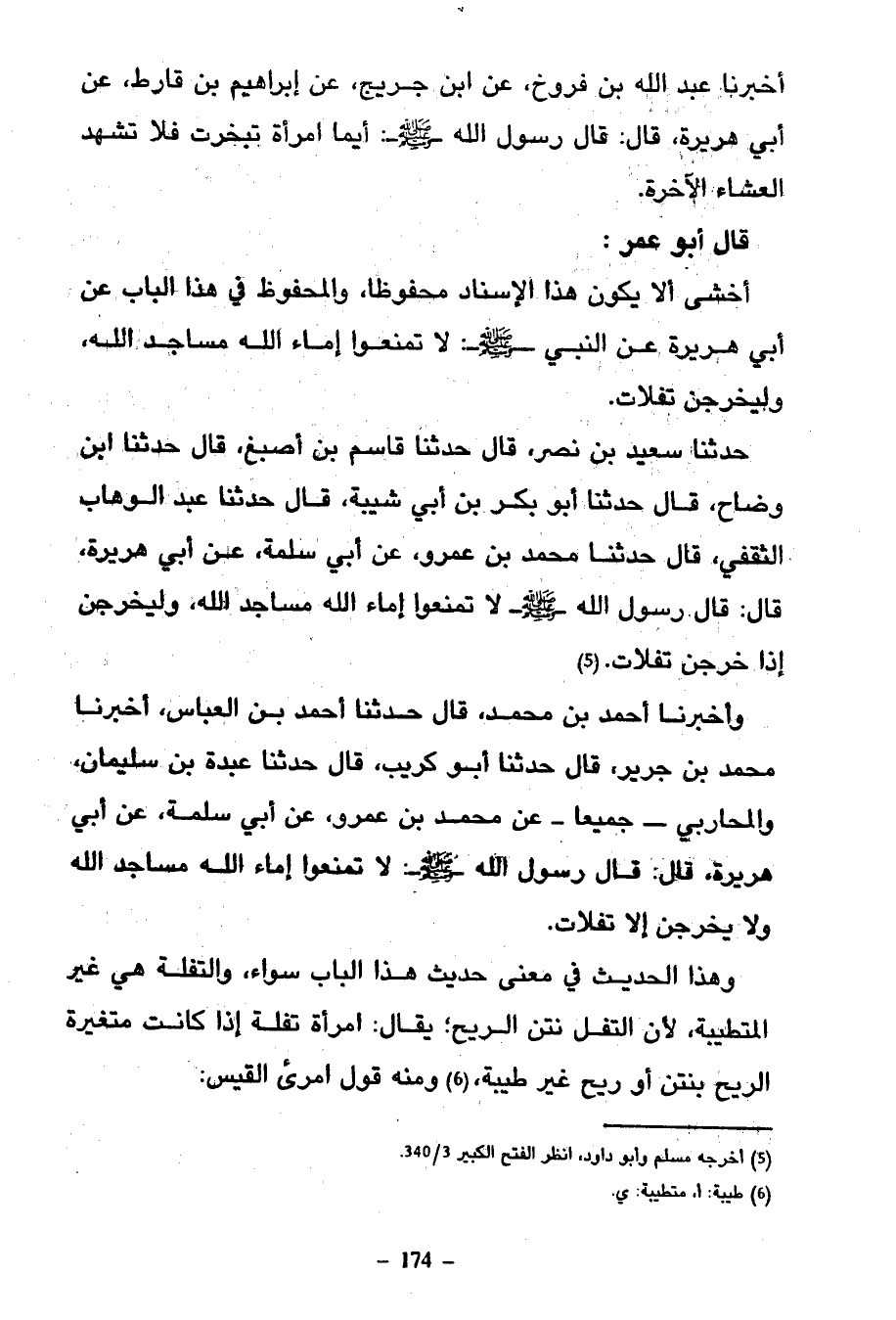 حَدَّثَنَا سَعِيدُ بْنُ نَصْرٍ قَالَ حَدَّثَنَا قَاسِمُ بْنُ أَصْبَغَ قَالَ حَدَّثَنَا ابْنُ وَضَّاحٍ قَالَ حَدَّثَنَا أَبُو بَكْرِ بْنُ أَبِي شَيْبَةَ قَالَ حَدَّثَنَا عَبْدُ الْوَهَّابِ الثَّقَفِيُّ قَالَ حَدَّثَنَا مُحَمَّدُ بْنُ عَمْرٍو عَنْ أَبِي سَلَمَةَ عَنْ أَبِي هُرَيْرَةَ قَالَ قَالَ رَسُولُ اللَّهِ صَلَّى الله عليه وسلم لا تَمْنَعُوا إِمَاءَ اللَّهِ مَسَاجِدَ اللَّهِ وَلْيَخْرُجَنَّ إِذَا خرجن تفلات