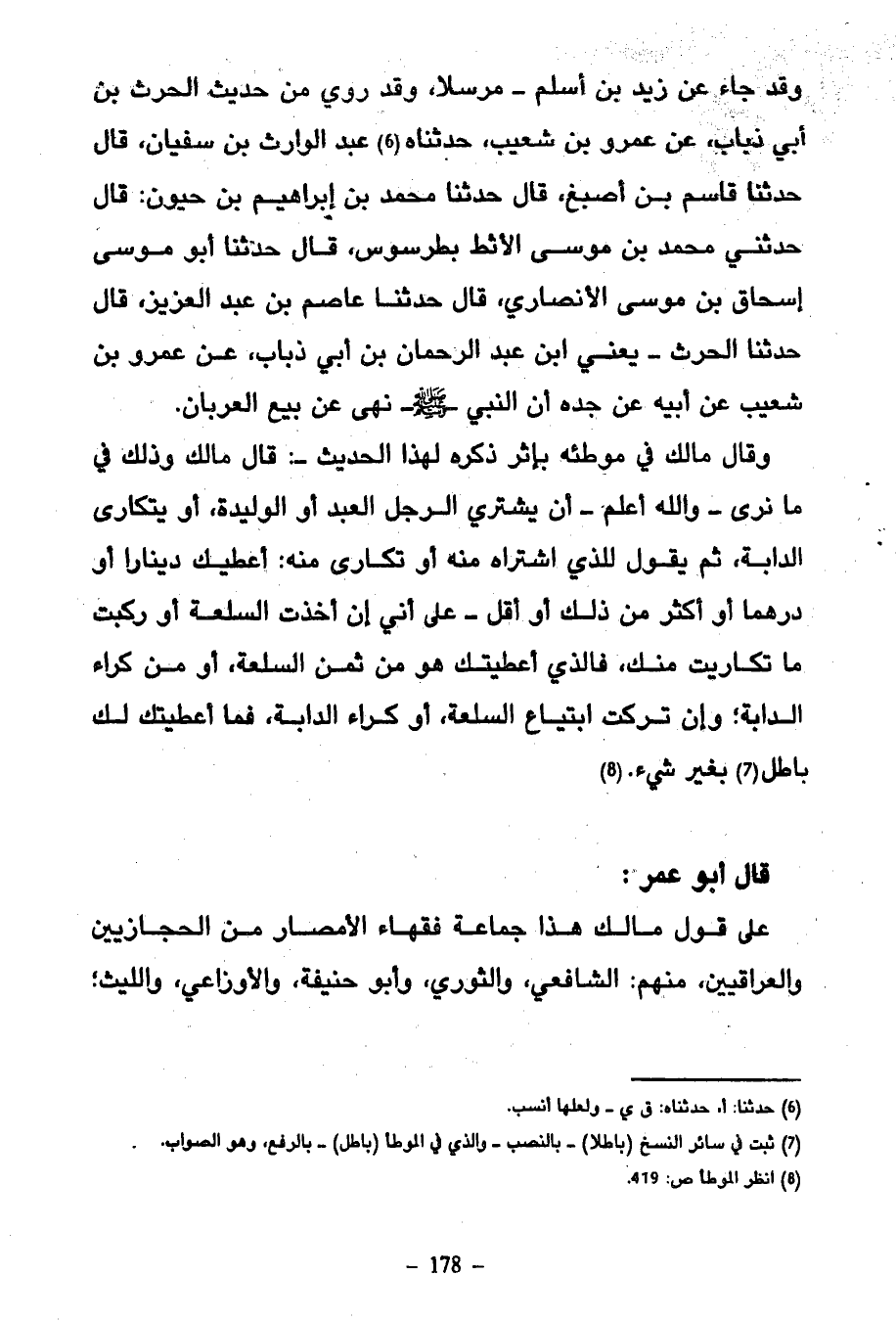 قَالَ أَبُو عُمَرَ عَلَى قَوْلِ مَالِكٍ هَذَا جَمَاعَةُ فُقَهَاءِ الْأَمْصَارِ مِنَ الْحِجَازِيِّينَ وَالْعِرَاقِيِّينَ مِنْهُمُ الشَّافِعِيُّ وَالثَّوْرِيُّ وَأَبُو حَنِيفَةَ والأوزاعي والليث