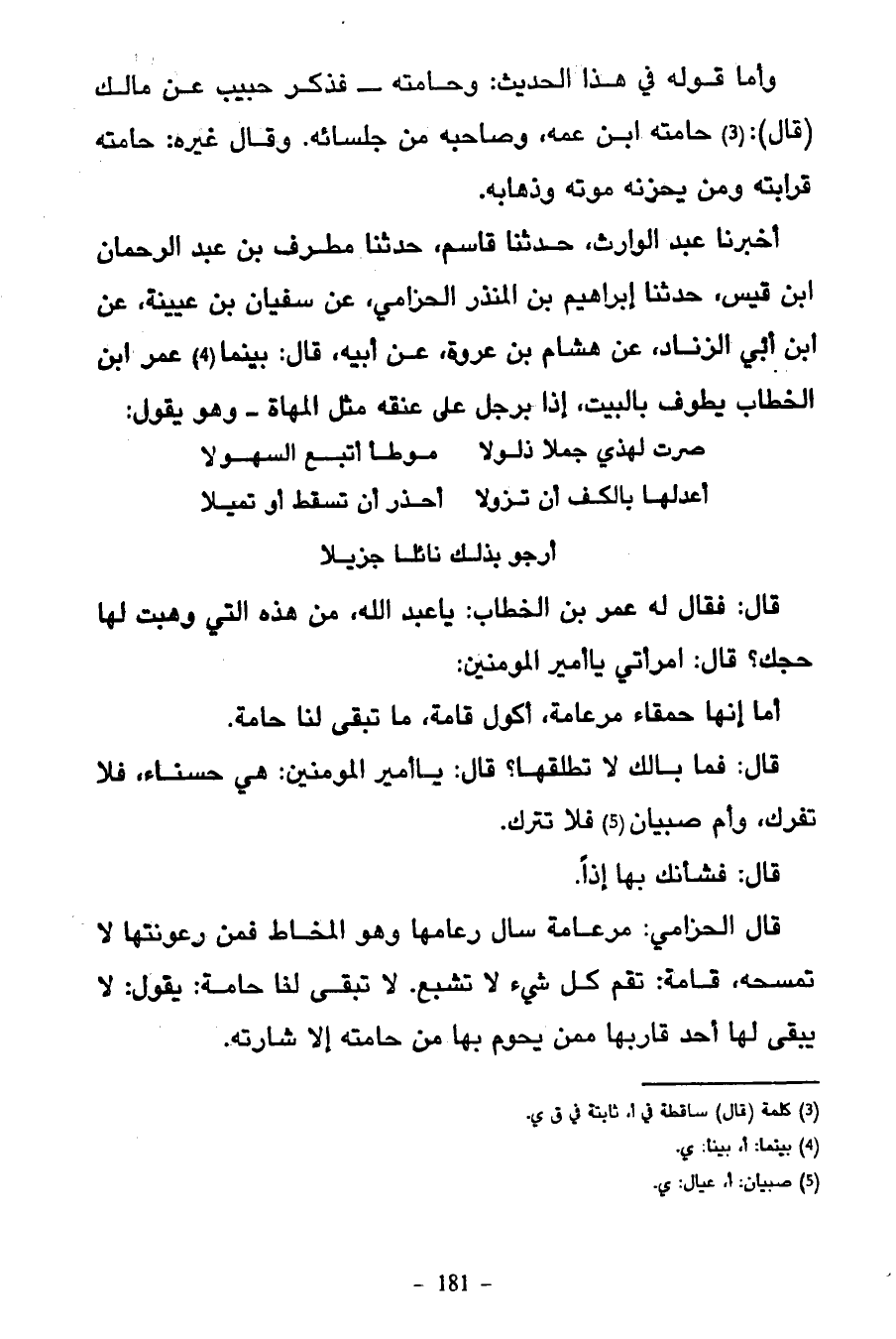 أَخْبَرَنَا عَبْدُ الْوَارِثِ حَدَّثَنَا قَاسِمٌ حَدَّثَنَا مُطَرِّفُ بْنُ عَبْدِ الرَّحْمَنِ ابن قَيْسٍ حَدَّثَنَا إِبْرَاهِيمُ بْنُ الْمُنْذِرِ الْحِزَامِيُّ عَنْ سُفْيَانَ بْنِ عُيَيْنَةَ عَنِ ابْنُ أَبِي الزِّنَادِ عَنْ هِشَامِ بْنِ عُرْوَةَ عَنْ أَبِيهِ قَالَ بينما عمر ابن الْخَطَّابِ يَطُوفُ بِالْبَيْتِ إِذَا بِرَجُلٍ عَلَى عُنُقِهِ مِثْلُ الْمَهَاةِ وَهُوَ يَقُولُ صِرْتُ لِهَذِي جَمَلًا ذَلُولًا مُوَطَّأٌ أَتْبَعُ السَّهُولَا أَعْدِلُهَا بِالْكَفِّ أَنْ تَزُولَا أَحْذَرُ أَنْ تَسْقُطَ أَوْ تَمِيلَا أَرْجُو بِذَلِكَ نَائِلًا جَزِيلَا قَالَ فَقَالَ لَهُ عُمَرُ بْنُ الْخَطَّابِ يَا عَبْدَ اللَّهِ مَنْ هَذِهِ الَّتِي وَهَبْتَ لَهَا حَجَّكَ قَالَ امْرَأَتِي يَا أمير المؤمنين أَمَا إِنَّهَا حَمْقَاءُ مُرْعَامَةٌ أَكُولٌ قَامَةٌ مَا تَبْقَى لَنَا حَامَّةٌ