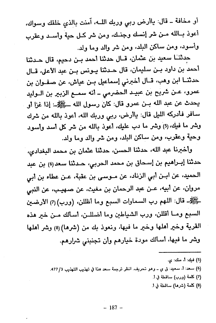 أَوْ مَخَافَةٍ قَالَ يَا أَرْضُ رَبِّي وَرَبُّكِ اللَّهُ آمَنْتُ بِالَّذِي خَلَقَكِ وَسَوَّاكِ أَعُوذُ بِاللَّهِ مِنْ شَرِّ إِنْسِكِ وَجِنَّكِ وَمِنْ شَرِّ كُلِّ حَيَّةٍ وَأَسَدٍ وَعَقْرَبٍ وَأَسْوَدَ وَمِنْ سَاكِنِ الْبَلَدِ وَمِنْ شَرِّ وَالِدٍ وَمَا وَلَدَ