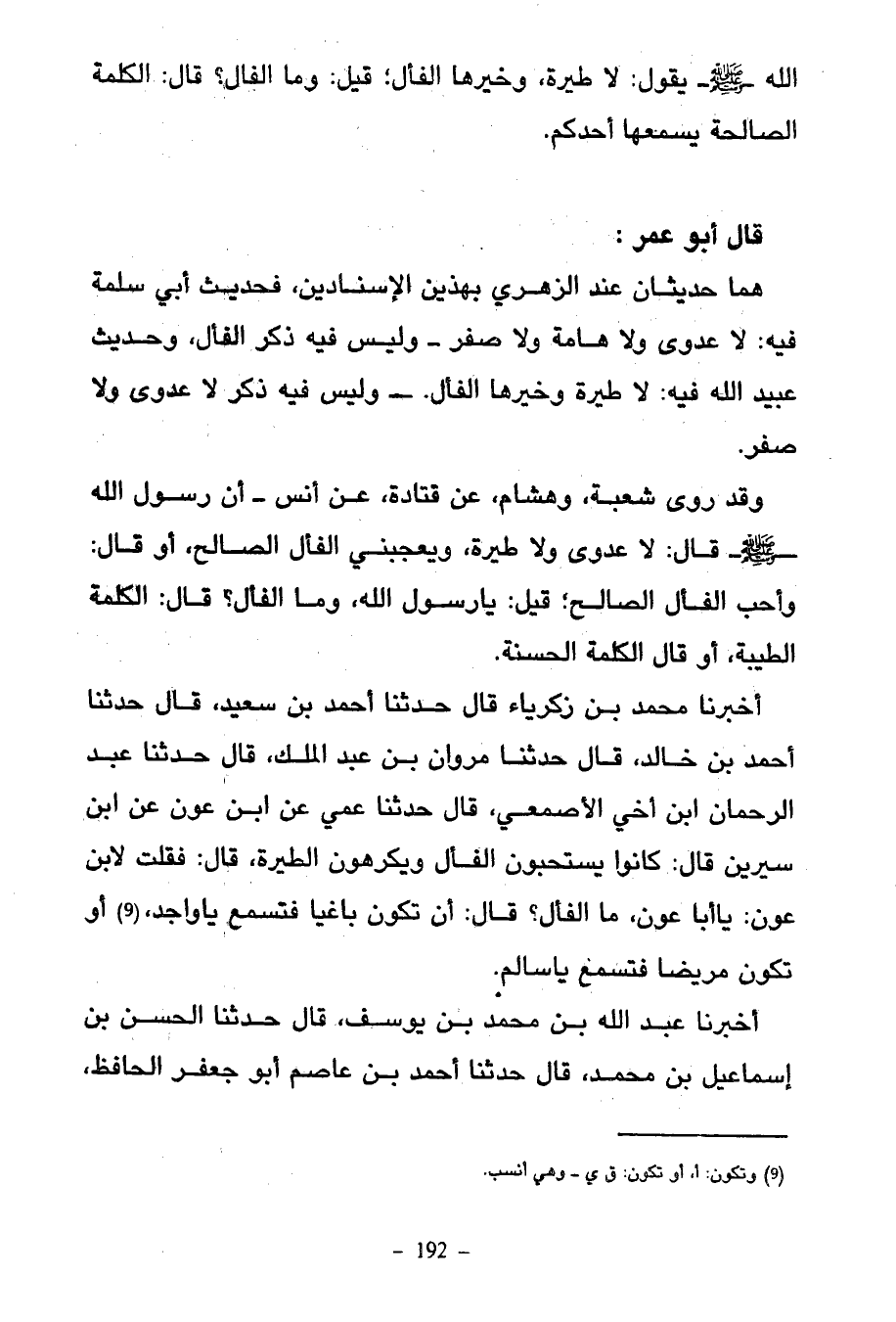 أَخْبَرَنَا مُحَمَّدُ بْنُ زَكَرِيَّاءَ قَالَ حَدَّثَنَا أَحْمَدُ بْنُ سَعِيدٍ قَالَ حَدَّثَنَا أَحْمَدُ بْنُ خَالِدٍ قَالَ حَدَّثَنَا مَرْوَانُ بْنُ عَبْدِ الْمَلِكِ قَالَ حَدَّثَنَا عبد الرحمن ابن أَخِي الْأَصْمَعِيِّ قَالَ حَدَّثَنَا عَمِّي عَنِ ابْنِ عَوْنٍ عَنِ ابْنِ سِيرِينَ قَالَ كَانُوا يَسْتَحِبُّونَ الْفَأْلَ وَيَكْرَهُونَ الطِّيَرَةَ قَالَ فَقُلْتُ لِابْنِ عَوْنٍ يَا أَبَا عَوْنٍ مَا الْفَأْلُ قَالَ أَنْ تَكُونَ بَاغِيًا فَتَسْمَعَ يَا وَاجِدُ أَوْ تَكُونَ مَرِيضًا فَتَسْمَعَ يَا سَالِمُ
