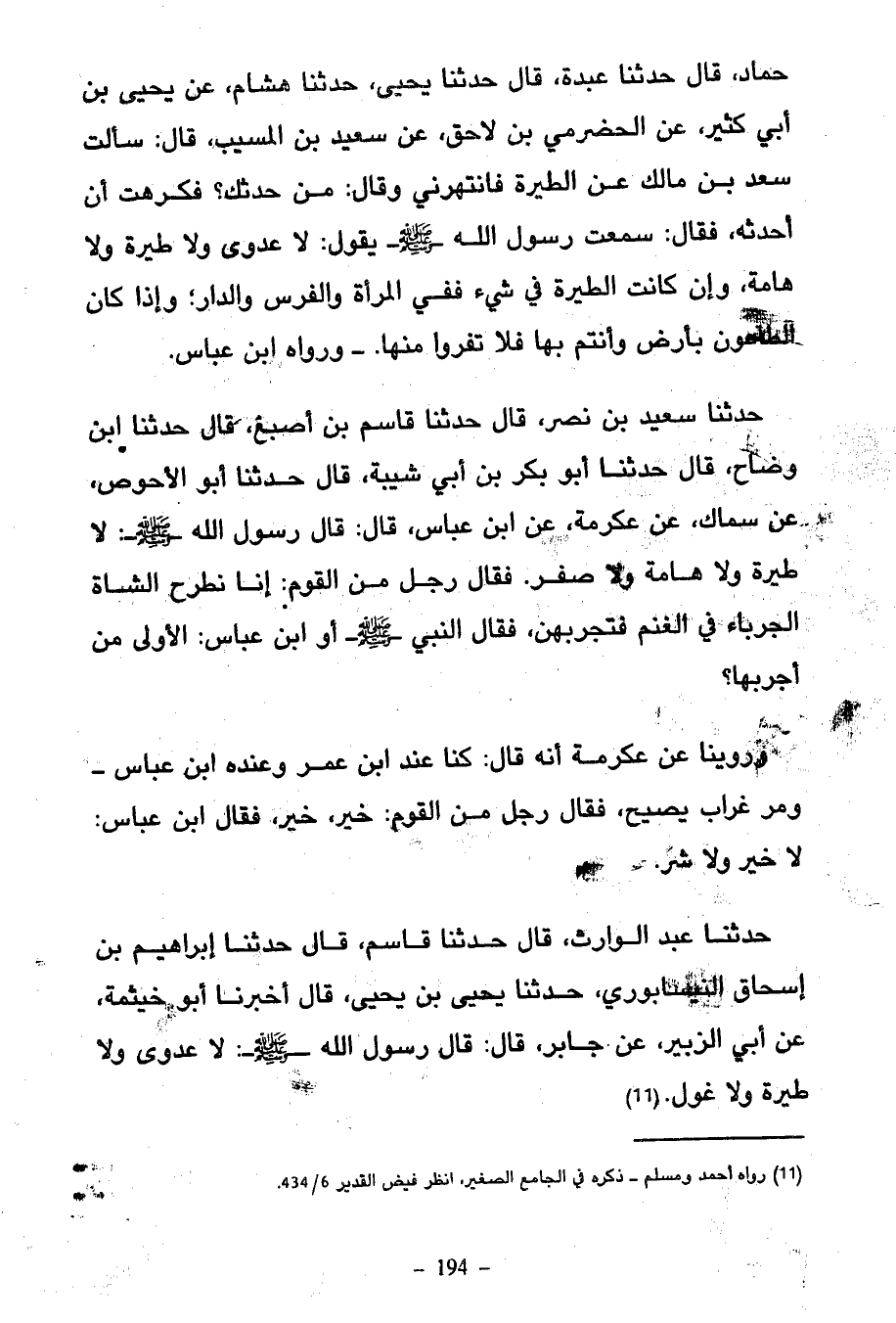 حَدَّثَنَا سَعِيدُ بْنُ نَصْرٍ قَالَ حَدَّثَنَا قَاسِمُ بْنُ أَصْبَغَ قَالَ حَدَّثَنَا ابْنُ وَضَّاحٍ قَالَ حَدَّثَنَا أَبُو بَكْرِ بْنُ أَبِي شَيْبَةَ قَالَ حَدَّثَنَا أَبُو الْأَحْوَصِ عَنْ سِمَاكٍ عَنْ عِكْرِمَةَ عَنِ ابْنِ عَبَّاسٍ قَالَ قَالَ رَسُولُ اللَّهِ صَلَّى اللَّهُ عَلَيْهِ وَسَلَّمَ لَا طِيَرَةَ وَلَا هَامَةَ وَلَا صَفَرَ