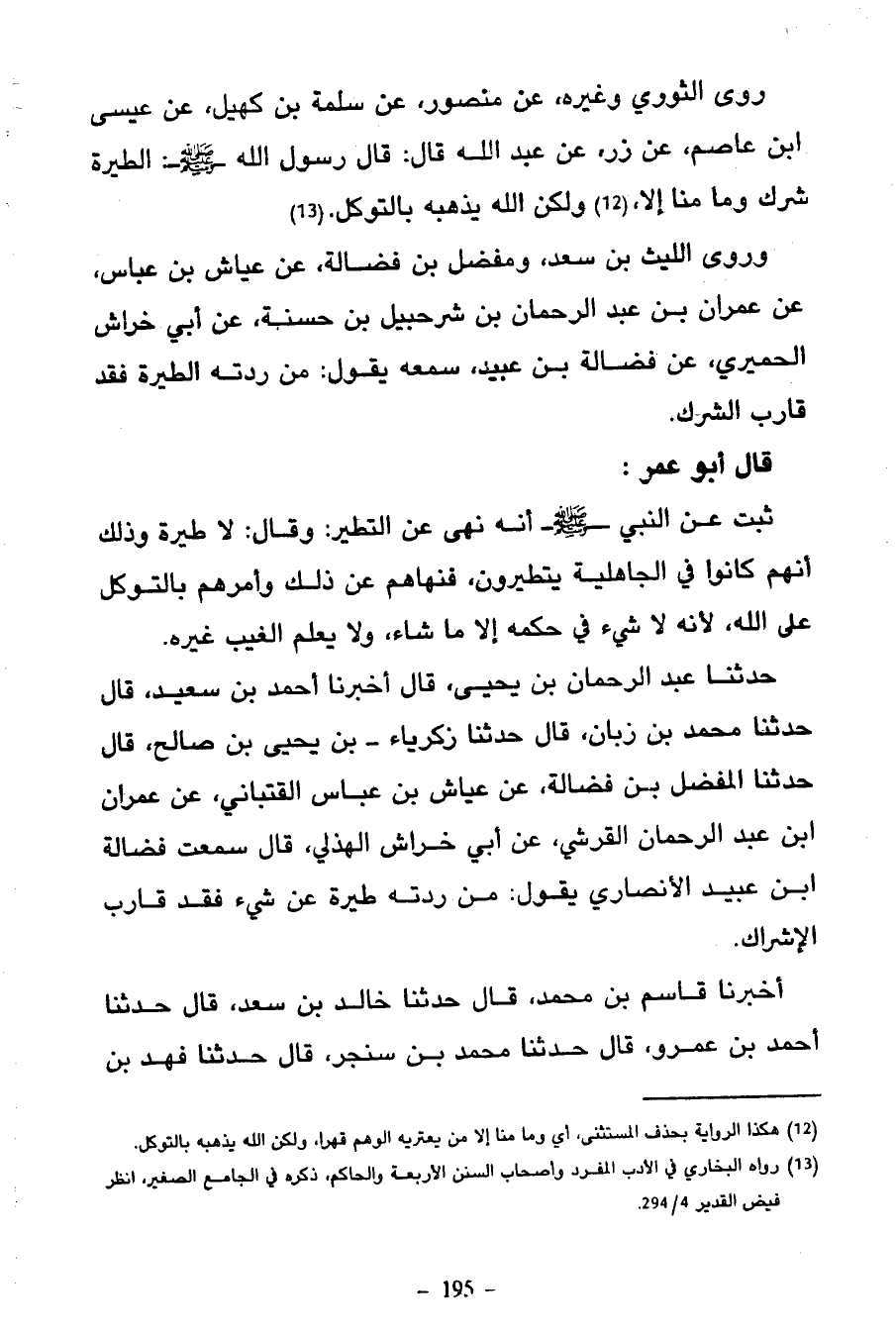 وَرَوَى اللَّيْثُ بْنُ سَعْدٍ وَمُفَضَّلُ بْنُ فَضَالَةَ عَنْ عَيَّاشِ بْنِ عَبَّاسٍ عَنْ عِمْرَانَ بْنِ عَبْدِ الرَّحْمَنِ بْنِ شُرَحْبِيلَ بْنِ حَسَنَةَ عَنْ أَبِي خِرَاشٍ الْحِمْيَرِيِّ عَنْ فَضَالَةَ بْنِ عُبَيْدٍ سَمِعَهُ يَقُولُ مَنْ رَدَّتْهُ الطِّيَرَةُ فَقَدْ قَارَبَ الشِّرْكَ