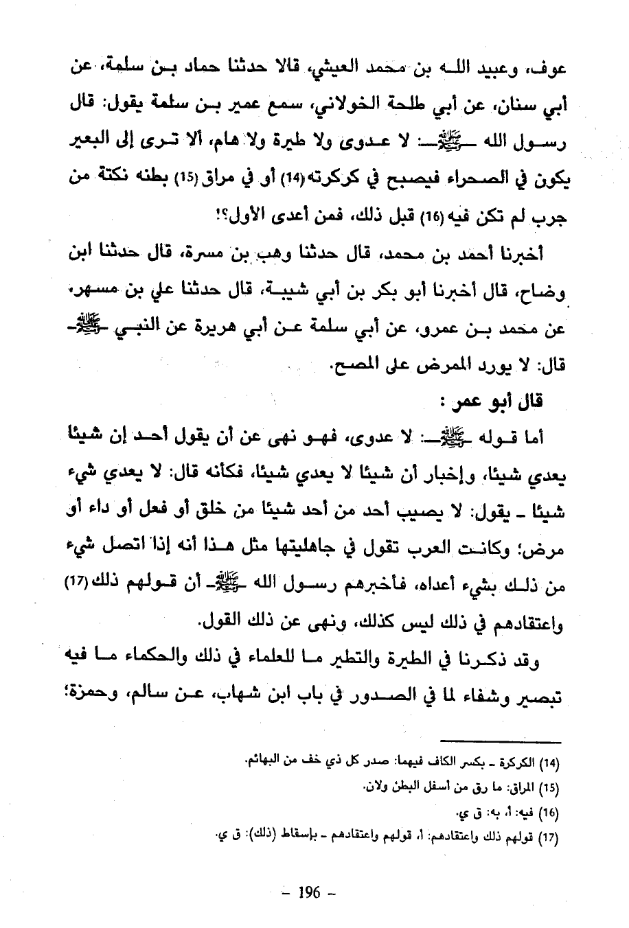قَالَ أَبُو عُمَرَ أَمَّا قَوْلُهُ صَلَّى اللَّهُ عَلَيْهِ وَسَلَّمَ لَا عَدْوَى فَهُوَ نَهَى عَنْ أَنْ يَقُولَ أَحَدٌ إِنَّ شَيْئًا يُعْدِي شَيْئًا وَإِخْبَارٌ أَنَّ شَيْئًا لَا يُعْدِي شَيْئًا فَكَأَنَّهُ قَالَ لَا يُعْدِي شَيْءٌ شَيْئًا يَقُولُ وَلَا يُصِيبُ أَحَدٌ مِنْ أَحَدٍ شَيْئًا مِنْ خَلْقٍ أَوْ فِعْلٍ أَوْ دَاءٍ أَوْ مَرَضٍ وَكَانَتِ الْعَرَبُ تَقُولُ فِي جَاهِلِيَّتِهَا مِثْلَ هَذَا أَنَّهُ إِذَا اتَّصَلَ شَيْءٌ مِنْ ذَلِكَ بِشَيْءٍ أَعْدَاهُ فَأَخْبَرَهُمْ رَسُولُ اللَّهِ صَلَّى اللَّهُ عَلَيْهِ وَسَلَّمَ أَنَّ قَوْلَهُمْ ذَلِكَ وَاعْتِقَادَهُمْ فِي ذَلِكَ لَيْسَ كَذَلِكَ وَنَهَى عَنْ ذَلِكَ الْقَوْلِ