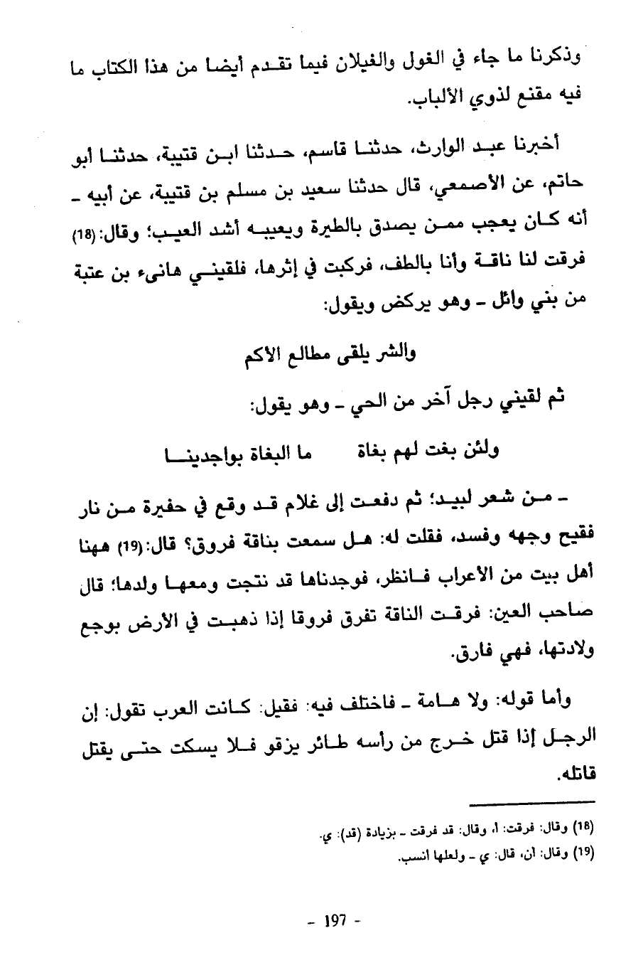أَخْبَرَنَا عَبْدُ الْوَارِثِ حَدَّثَنَا قَاسِمٌ حَدَّثَنَا ابْنُ قُتَيْبَةَ حَدَّثَنَا أَبُو حَاتِمٍ عَنِ الْأَصْمَعِيِّ قَالَ حَدَّثَنَا سَعِيدُ بْنُ مُسْلِمِ بْنِ قُتَيْبَةَ عَنْ أَبِيهِ أَنَّهُ كَانَ يَعْجَبُ مِمَّنْ يُصَدِّقُ بِالطِّيَرَةِ وَيَعِيبَهُ أَشَدَّ الْعَيْبِ وَقَالَ فَرَقَتْ لَنَا نَاقَةٌ وَأَنَا بِالطَّفِّ فَرَكِبْتُ فِي إثرها فلقيني هانىء بْنُ عُتْبَةَ مِنْ بَنِي وَائِلٍ وَهُوَ يَرْكُضُ وَيَقُولُ وَالشَّرُّ يَلْقَى مَطَالِعَ الْأَكَمِ ثُمَّ لَقِيَنِي رَجُلٌ آخَرُ مِنَ الْحَيِّ وَهُوَ يَقُولُ وَلَئِنْ بَغَتْ لَهُمْ بُغَاةٌ مَا الْبُغَاةُ بِوَاجِدِينَا مِنْ شِعْرِ لَبِيدٍ ثُمَّ دُفِعْتُ إِلَى غُلَامٍ قَدْ وَقَعَ فِي حُفَيْرَةٍ مِنْ نَارٍ فَقِيحَ وَجْهُهُ وَفَسَدَ فَقُلْتُ لَهُ هَلْ سَمِعْتَ بِنَاقَةٍ فَرُوقٍ قَالَ هَهُنَا أَهْلُ بَيْتٍ مِنَ الْأَعْرَابِ فَانْظُرْ فَوَجَدْنَاهَا قَدْ نَتَجَتْ وَمَعَهَا وَلَدُهَا قَالَ صَاحِبُ الْعَيْنِ فَرَقَتِ النَّاقَةُ تَفْرُقُ فُرُوقًا إِذَا ذَهَبَتْ فِي الْأَرْضِ بِوَجَعِ وِلَادَتِهَا فَهِيَ فَارِقٌ
