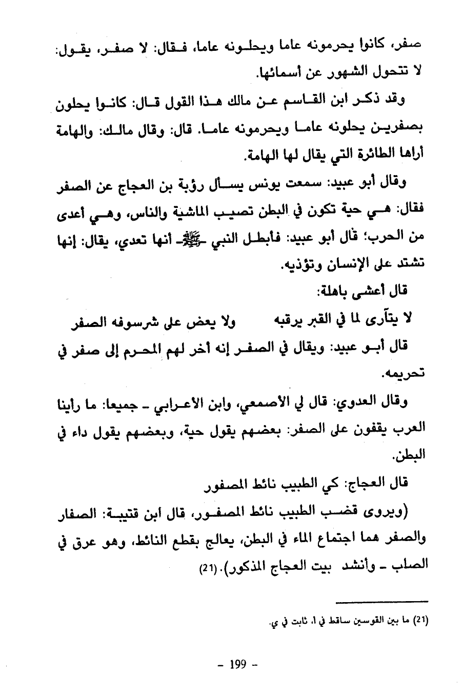 قَالَ أَعْشَى باهلة لا يتآوى لِمَا فِي الْقَبْرِ يَرْقُبُهُ وَلَا يَعَضُّ عَلَى شُرْسُوفِهِ الصَّفَرُ قَالَ أَبُو عُبَيْدٍ وَيُقَالُ فِي الصَّفَرِ إِنَّهُ أَخَّرَ لَهُمُ الْمُحَرَّمَ إِلَى صَفَرَ فِي تَحْرِيمِهِ