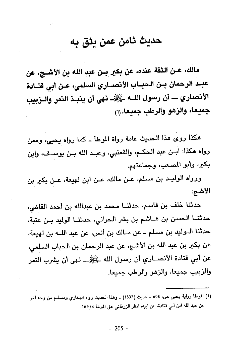 797 - مَالِكٌ عَنِ الثِّقَةِ عِنْدَهُ عَنْ بُكَيْرِ بْنِ عَبْدِ اللَّهِ بْنِ الْأَشَجِّ عَنْ عَبْدِ الرَّحْمَنِ بْنِ الْحُبَابِ الْأَنْصَارِيِّ السُّلَمِيِّ عَنْ أَبِي قَتَادَةَ الْأَنْصَارِيِّ أَنَّ رَسُولَ اللَّهِ صَلَّى اللَّهُ عَلَيْهِ وَسَلَّمَ نَهَى أَنْ يُنْبَذَ التَّمْرُ وَالزَّبِيبُ جَمِيعًا وَالزَّهْوُ وَالرُّطَبُ جَمِيعًا