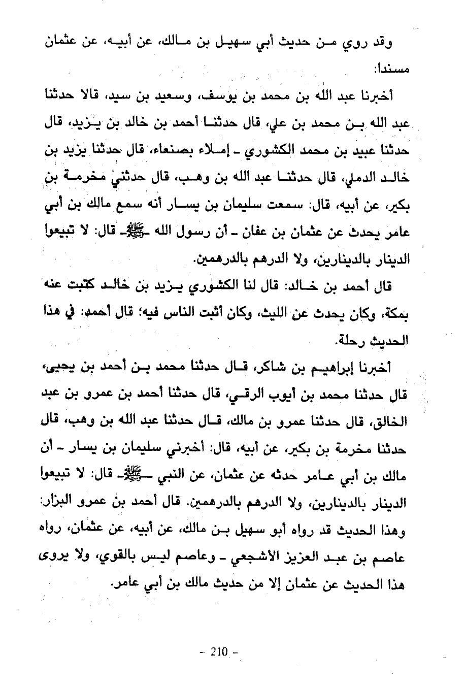 أَخْبَرَنَا عَبْدُ اللَّهِ بْنُ مُحَمَّدِ بْنِ يُوسُفَ وَسَعِيدُ بْنُ سَيِّدٍ قَالَا حَدَّثَنَا عَبْدُ اللَّهِ بْنُ مُحَمَّدِ بْنِ عَلِيٍّ قَالَ حَدَّثَنَا أَحْمَدُ بْنُ خَالِدِ بْنِ يَزِيدَ قَالَ حَدَّثَنَا عُبَيْدُ بْنُ مُحَمَّدٍ الْكَشْوَرِيُّ إِمْلَاءً بِصَنْعَاءَ قَالَ حَدَّثَنَا يَزِيدُ بْنُ خَالِدٍ الدُّمَلِيُّ قَالَ حَدَّثَنَا عَبْدُ اللَّهِ بْنُ وَهْبٍ قَالَ حَدَّثَنِي مَخْرَمَةُ بْنُ بُكَيْرٍ عَنْ أَبِيهِ قَالَ سَمِعْتُ سُلَيْمَانَ بْنَ يَسَارٍ أَنَّهُ سَمِعَ مَالِكَ بْنَ أَبِي عَامِرٍ يُحَدِّثُ عَنْ عُثْمَانَ بْنِ عَفَّانَ أَنَّ رَسُولَ اللَّهِ صَلَّى اللَّهُ عَلَيْهِ وَسَلَّمَ قَالَ لَا تَبِيعُوا الدِّينَارَ بِالدِّينَارَيْنِ وَلَا الدِّرْهَمَ بِالدِّرْهَمَيْنِ