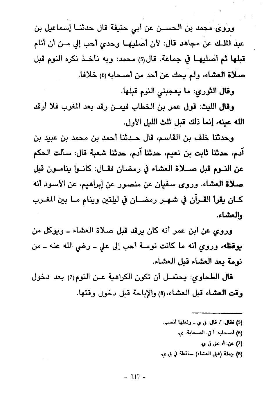وَرُوِيَ عَنِ ابْنِ عُمَرَ أَنَّهُ كَانَ يَرْقُدُ قَبْلَ صَلَاةِ الْعِشَاءِ وَيُوكِلُ مَنْ يُوقِظُهُ وَرُوِيَ أَنَّهُ مَا كَانَتْ نَوْمَةٌ أَحَبَّ إِلَى عَلِيٍّ رَضِيَ اللَّهُ عَنْهُ مِنْ نَوْمَةٍ بَعْدَ الْعَشَاءِ قَبْلَ الْعِشَاءِ