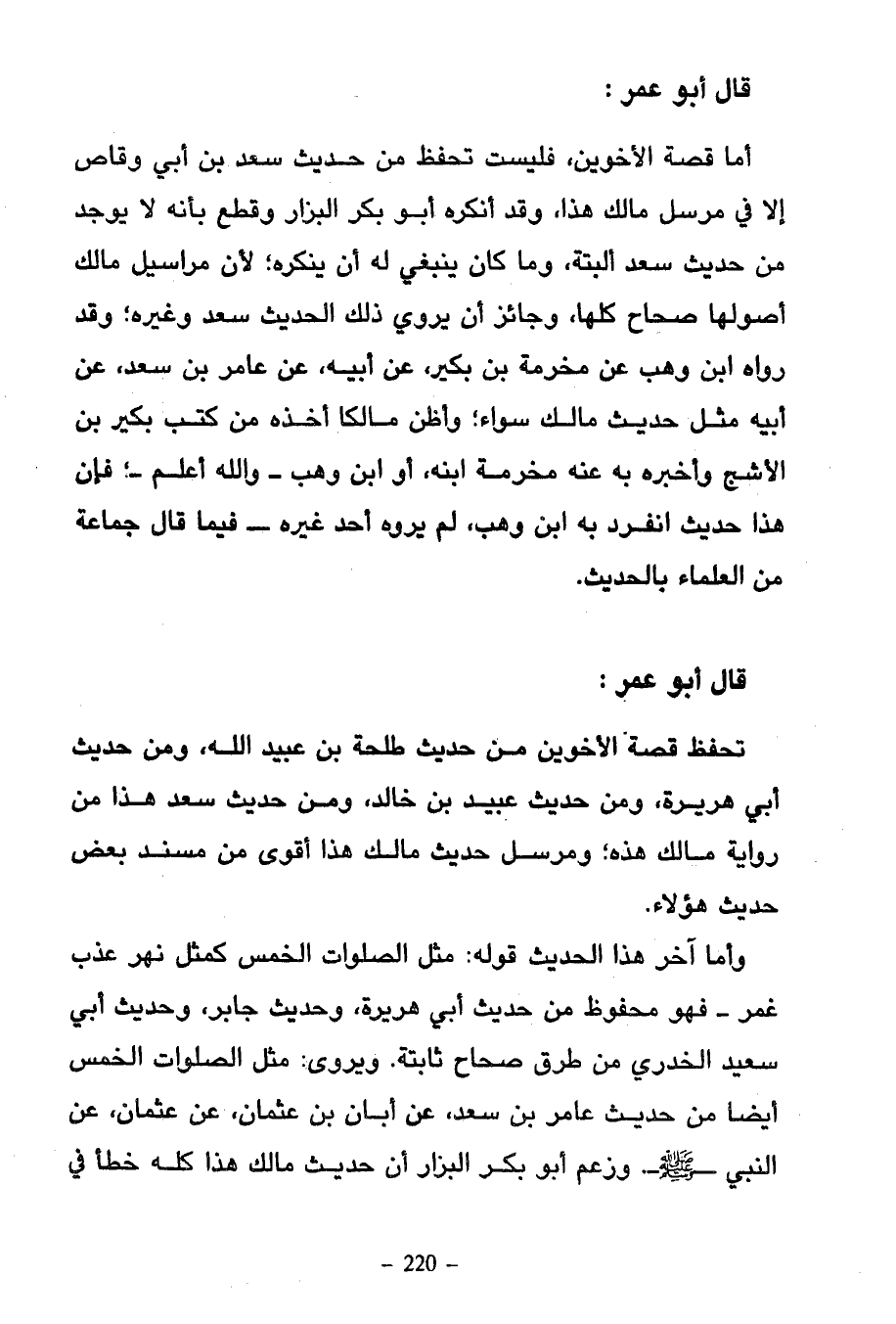 قَالَ أَبُو عُمَرَ أَمَّا قِصَّةُ الْأَخَوَيْنِ فَلَيْسَتْ تُحْفَظُ مِنْ حَدِيثِ سَعِيدِ بْنِ أَبِي وَقَّاصٍ إِلَّا فِي مُرْسَلِ مَالِكٍ هَذَا وَقَدْ أَنْكَرَهُ أَبُو بَكْرٍ الْبَزَّارُ وَقَطَعَ بِأَنَّهُ لَا يُوجَدُ مِنْ حَدِيثِ سَعْدٍ الْبَتَّةَ وَمَا كَانَ يَنْبَغِي لَهُ أَنْ يُنْكِرَهُ لِأَنَّ مَرَاسِيلَ مَالِكٍ أُصُولُهَا صِحَاحٌ كُلُّهَا وَجَائِزٌ أَنْ يَرْوِيَ ذَلِكَ الْحَدِيثَ سَعْدٌ وَغَيْرُهُ وَقَدْ رَوَاهُ ابْنِ وَهْبٍ عَنْ مَخْرَمَةَ بْنِ بُكَيْرٍ عَنْ أَبِيهِ عن عامر بْنِ سَعْدٍ عَنْ أَبِيهِ مِثْلَ حَدِيثِ مَالِكٍ سَوَاءً وَأَظُنُّ مَالِكًا أَخَذَهُ مِنْ كُتُبِ بُكَيْرِ بْنِ الْأَشَجِّ وَأَخْبَرَهُ بِهِ عَنْهُ مَخْرَمَةُ ابْنُهُ أَوِ ابْنُ وَهْبٍ وَاللَّهُ أَعْلَمُ فَإِنَّ هَذَا حَدِيثٌ انْفَرَدَ بِهِ ابْنُ وَهْبٍ لَمْ يَرْوِهِ أَحَدٌ غَيْرُهُ فِيمَا قَالَ جَمَاعَةٌ مِنَ الْعُلَمَاءِ بِالْحَدِيثِ