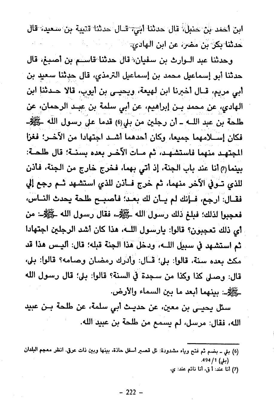 وَحَدَّثَنَا عَبْدُ الْوَارِثِ بْنُ سُفْيَانَ قَالَ حَدَّثَنَا قَاسِمُ بْنُ أَصْبَغَ قَالَ حَدَّثَنَا أَبُو إِسْمَاعِيلَ مُحَمَّدُ بْنُ إِسْمَاعِيلَ التِّرْمِذِيُّ قَالَ حَدَّثَنَا سَعِيدُ بْنُ أَبِي مَرْيَمَ قَالَ أَخْبَرَنَا ابْنُ لَهِيعَةَ وَيَحْيَى بْنُ أَيُّوبَ قَالَا حَدَّثَنَا ابْنِ الْهَادِي عَنْ مُحَمَّدِ بْنِ إِبْرَاهِيمَ عَنْ أَبِي سَلَمَةَ بْنِ عَبْدِ الرَّحْمَنِ عَنْ طَلْحَةَ بْنِ عَبْدِ اللَّهِ أَنَّ رَجُلَيْنِ مِنْ بُلَيٍّ قَدِمَا عَلَى رَسُولِ اللَّهِ صَلَّى اللَّهُ عَلَيْهِ وَسَلَّمَ فَكَانَ إِسْلَامُهُمَا جَمِيعًا وَكَانَ أَحَدُهُمَا أَشَدَّ اجْتِهَادًا مِنَ الْآخَرِ فَغَزَا الْمُجْتَهِدُ مِنْهُمَا فَاسْتُشْهِدَ ثُمَّ مَاتَ الْآخَرُ بَعْدَهُ بِسَنَةٍ قَالَ طَلْحَةُ بَيْنَمَا أَنَا عِنْدَ بَابِ الْجَنَّةِ إِذْ أُتِيَ بِهِمَا فَخَرَجَ خَارِجٌ مِنَ الْجَنَّةِ فَأَذِنَ لِلَّذِي تُوُفِّيَ الْآخِرَ مِنْهُمَا ثُمَّ خَرَجَ فَأَذِنَ لِلَّذِي اسْتُشْهِدَ ثُمَّ رَجَعَ إِلَيَّ فَقَالَ ارْجِعْ فَإِنَّكَ لَمْ يَأْنِ لَكَ بَعْدُ فَأَصْبَحَ طَلْحَةُ يُحَدِّثُ النَّاسَ فَعَجِبُوا لِذَلِكَ فَبَلَغَ ذَلِكَ رَسُولَ اللَّهِ صَلَّى اللَّهُ عَلَيْهِ وَسَلَّمَ فَقَالَ رَسُولُ اللَّهِ صَلَّى اللَّهُ عَلَيْهِ وَسَلَّمَ مِنْ أَيِّ ذَلِكَ تَعْجَبُونَ قَالُوا يَا رَسُولَ اللَّهِ هَذَا كَانَ أَشَدَّ الرَّجُلَيْنِ اجْتِهَادًا ثُمَّ اسْتُشْهِدَ فِي سَبِيلِ اللَّهِ وَدَخَلَ هَذَا الْجَنَّةَ قَبْلَهُ قَالَ أَلَيْسَ هَذَا قَدْ مَكَثَ بَعْدَهُ سَنَةً قَالُوا بَلَى قَالَ وَأَدْرَكَ رَمَضَانَ وَصَامَهُ قَالُوا بَلَى قَالَ وَصَلَّى كَذَا وَكَذَا مِنْ سَجْدَةٍ فِي السَّنَةِ قَالُوا بَلَى قَالَ رَسُولُ اللَّهِ صَلَّى اللَّهُ عَلَيْهِ وَسَلَّمَ بَيْنَهُمَا أَبْعَدُ مَا بَيْنَ السَّمَاءِ وَالْأَرْضِ