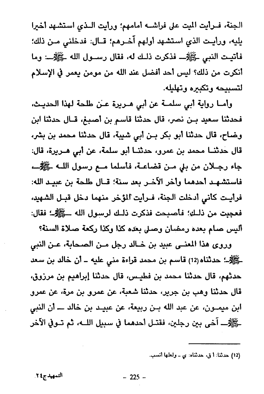 وَأَمَّا رِوَايَةُ أَبِي سَلَمَةَ عَنْ أَبِي هُرَيْرَةَ عَنِ طَلْحَةَ لِهَذَا الْحَدِيثِ فَحَدَّثَنَا سَعِيدُ بْنُ نَصْرٍ قَالَ حَدَّثَنَا قَاسِمُ بْنُ أَصْبَغَ قَالَ حَدَّثَنَا ابْنُ وَضَّاحٍ قَالَ حَدَّثَنَا أَبُو بَكْرِ بْنُ أَبِي شَيْبَةَ قَالَ حَدَّثَنَا مُحَمَّدُ بْنُ بِشْرٍ قَالَ حَدَّثَنَا مُحَمَّدُ بْنُ عَمْرٍو حَدَّثَنَا أَبُو سَلَمَةَ عَنْ أَبِي هُرَيْرَةَ قَالَ جَاءَ رَجُلَانِ مِنْ بُلَيٍّ مِنْ قُضَاعَةَ فَأَسْلَمَا مَعَ رَسُولِ اللَّهِ صَلَّى اللَّهُ عَلَيْهِ وَسَلَّمَ فَاسْتُشْهِدَ أَحَدُهُمَا وَأُخِّرَ الْآخَرُ بَعْدَ سَنَةٍ قَالَ طَلْحَةُ بْنُ عُبَيْدِ اللَّهِ فَرَأَيْتُ كَأَنِّي أُدْخِلْتُ الْجَنَّةَ فَرَأَيْتُ الْمُؤَخَّرَ مِنْهُمَا دَخَلَ قَبْلَ الشَّهِيدِ فَعَجِبْتُ مِنْ ذَلِكَ فَأَصْبَحْتُ فَذَكَرْتُ ذَلِكَ لِرَسُولِ اللَّهِ صَلَّى اللَّهُ عَلَيْهِ وَسَلَّمَ فَقَالَ أَلَيْسَ صَامَ بَعْدَهُ رَمَضَانَ وَصَلَّى بَعْدَهُ كَذَا وَكَذَا رَكْعَةً صَلَاةَ السَّنَةِ وَرَوَى هَذَا الْمَعْنَى عُبَيْدُ بْنُ خَالِدٍ رَجُلٌ مِنَ الصَّحَابَةِ عَنِ النَّبِيِّ صَلَّى اللَّهُ عَلَيْهِ وَسَلَّمَ حَدَّثَنَاهُ قَاسِمُ بْنُ مُحَمَّدٍ قِرَاءَةً مِنِّي عَلَيْهِ أَنَّ خَالِدَ بْنَ سَعْدٍ حَدَّثَهُمْ قَالَ حَدَّثَنَا مُحَمَّدُ بْنُ فُطَيْسٍ قَالَ حَدَّثَنَا إِبْرَاهِيمُ بْنُ مَرْزُوقٍ قَالَ حَدَّثَنَا وَهَبُ بْنُ جَرِيرٍ حَدَّثَنَا شُعْبَةُ عَنْ عَمْرِو بْنِ مُرَّةَ عَنْ عمرو ابن مَيْمُونٍ عَنْ عَبْدِ اللَّهِ بْنِ رَبِيعَةَ عَنْ عُبَيْدِ بْنِ خَالِدٍ أَنَّ النَّبِيَّ صَلَّى اللَّهُ عَلَيْهِ وَسَلَّمَ آخَى بَيْنَ رَجُلَيْنِ فَقُتِلَ أَحَدُهُمَا فِي سَبِيلِ اللَّهِ ثُمَّ تُوُفِّيَ الْآخَرُ