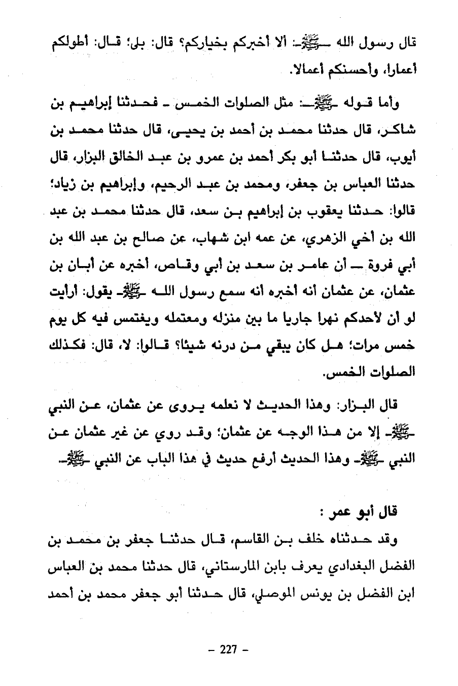 وَأَمَّا قَوْلُهُ صَلَّى اللَّهُ عَلَيْهِ وَسَلَّمَ مَثَلُ الصَّلَوَاتِ الْخَمْسِ فَحَدَّثَنَا إِبْرَاهِيمُ بْنُ شَاكِرٍ قَالَ حَدَّثَنَا مُحَمَّدُ بْنُ أَحْمَدَ بْنِ يَحْيَى قَالَ حَدَّثَنَا مُحَمَّدُ بْنُ أَيُّوبَ قَالَ حَدَّثَنَا أَبُو بَكْرٍ أَحْمَدُ بْنُ عَمْرِو بْنِ عَبْدِ الْخَالِقِ الْبَزَّارُ قَالَ حَدَّثَنَا الْعَبَّاسُ بْنُ جَعْفَرٍ وَمُحَمَّدُ بْنُ عَبْدِ الرَّحِيمِ وَإِبْرَاهِيمُ بْنُ زِيَادٍ قَالُوا حَدَّثَنَا يَعْقُوبُ بْنُ إِبْرَاهِيمَ بْنِ سَعْدٍ قَالَ حَدَّثَنَا مُحَمَّدُ بْنُ عَبْدِ اللَّهِ بْنِ أَخِي الزُّهْرِيِّ عَنْ عَمِّهِ ابْنِ شِهَابٍ عَنْ صَالِحِ بْنِ عَبْدِ اللَّهِ بْنِ أَبِي فَرْوَةَ أَنَّ عَامِرَ بْنَ سَعِيدِ بْنِ أَبِي وَقَّاصٍ أَخْبَرَهُ عَنْ أَبَانَ بْنِ عُثْمَانَ عَنْ عُثْمَانَ أَنَّهُ أَخْبَرَهُ أَنَّهُ سَمِعَ رَسُولَ اللَّهِ صَلَّى اللَّهُ عَلَيْهِ وَسَلَّمَ يَقُولُ أَرَأَيْتَ لَوْ أَنَّ لِأَحَدِكُمْ نَهَرًا جَارِيًا مَا بَيْنَ مَنْزِلِهِ وَمُعْتَمَلِهِ وَيَغْتَمِسُ فِيهِ كُلَّ يَوْمٍ خَمْسَ مَرَّاتٍ هَلْ كَانَ يُبْقِي مِنْ دَرَنِهِ شَيْئًا قَالُوا لَا قَالَ فَكَذَلِكَ الصَّلَوَاتُ الْخَمْسُ