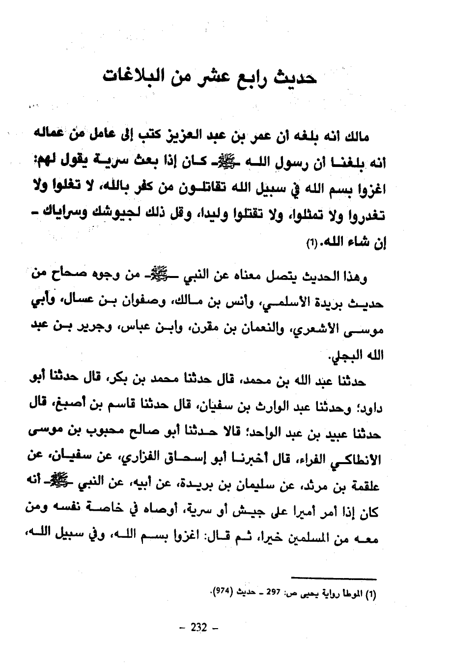 308 - مَالِكٌ أَنَّهُ بَلَغَهُ أَنَّ عُمَرَ بْنَ عَبْدِ الْعَزِيزِ كَتَبَ إِلَى عَامِلٍ مِنْ عُمَّالِهِ أَنَّهُ بَلَغَنَا أَنَّ رَسُولَ اللَّهِ صَلَّى اللَّهُ عَلَيْهِ وَسَلَّمَ كَانَ إِذَا بَعَثَ سَرِيَّةً يَقُولُ لَهُمْ اغْزُوا بِسْمِ اللَّهِ فِي سَبِيلِ اللَّهِ تُقَاتِلُونَ مَنْ كَفَرَ بِاللَّهِ لَا تَغُلُّوا وَلَا تَغْدِرُوا وَلَا تُمَثِّلُوا وَلَا تَقْتُلُوا وَلِيدًا وَقُلْ ذَلِكَ لِجُيُوشِكَ وَسَرَايَاكَ إِنْ شَاءَ اللَّهُ (21 11)