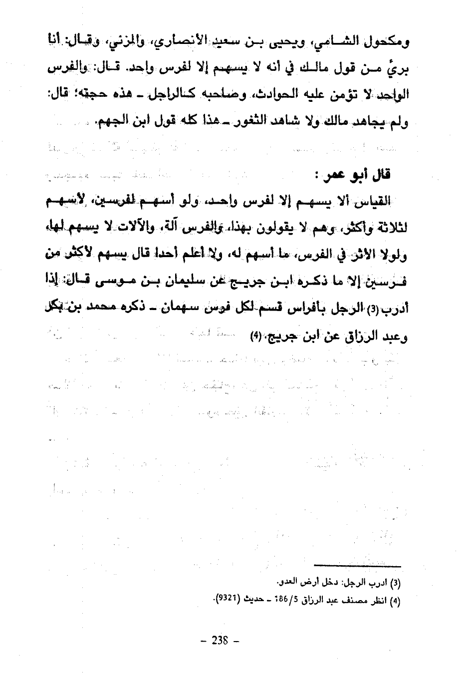 قَالَ أَبُو عُمَرَ الْقِيَاسُ أَلَّا يُسْهَمَ إِلَّا لِفَرَسٍ وَاحِدٍ وَلَوْ أُسْهِمَ لِفَرَسَيْنِ لَأُسْهِمَ لِثَلَاثَةٍ وَأَكْثَرَ وَهُمْ لَا يَقُولُونَ بِهَذَا وَالْفَرَسُ آلَةٌ وَالْآلَاتُ لَا يُسْهَمُ لَهَا وَلَوْلَا الْأَثَرُ فِي الْفَرَسِ مَا أُسْهِمَ لَهُ وَلَا أَعْلَمُ أَحَدًا قَالَ يُسْهَمُ لِأَكْثَرَ مِنْ فَرَسَيْنِ إِلَّا مَا ذَكَرَهُ ابْنُ جُرَيْجٍ عَنْ سُلَيْمَانَ بْنِ مُوسَى قَالَ إِذَا أَدْرَبَ الرَّجُلُ بِأَفْرَاسٍ قُسِمَ لِكُلِّ فَرَسٍ سَهْمَانِ ذَكَرَهُ مُحَمَّدُ بْنُ بَكْرٍ وَعَبْدُ الرَّزَّاقِ عَنِ ابْنِ جُرَيْجٍ