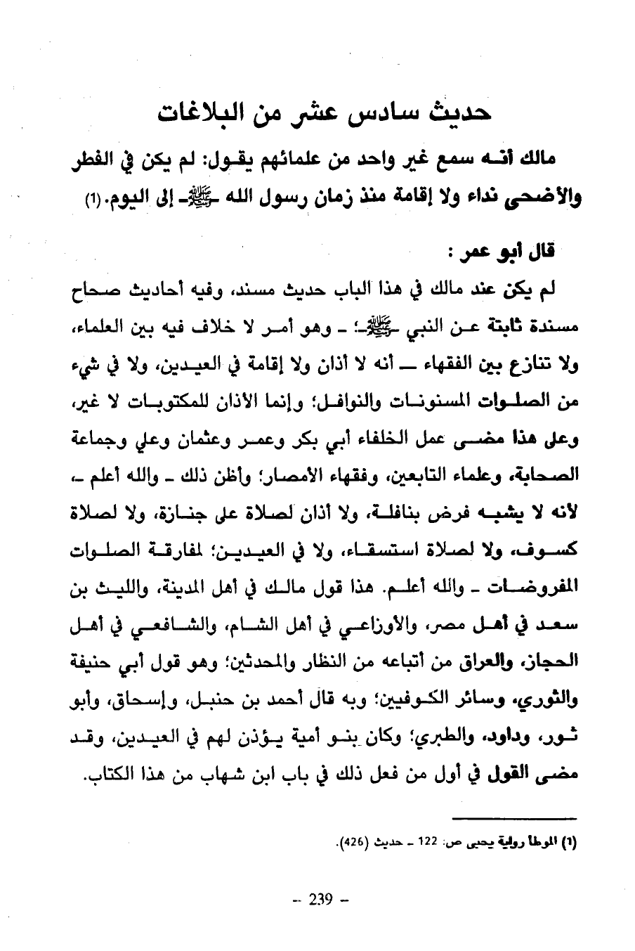 قَالَ أَبُو عُمَرَ لَمْ يَكُنْ عِنْدَ مَالِكٍ فِي هَذَا الْبَابِ حَدِيثٌ مُسْنَدٌ وَفِيهِ أَحَادِيثُ صِحَاحٌ مُسْنَدَةٌ ثَابِتَةٌ عَنِ النَّبِيِّ صَلَّى اللَّهُ عَلَيْهِ وَسَلَّمَ وَهُوَ أَمْرٌ لَا خِلَافَ فِيهِ بَيْنَ الْعُلَمَاءِ وَلَا تَنَازُعَ بَيْنَ الْفُقَهَاءِ أَنَّهُ لَا أَذَانَ وَلَا إِقَامَةَ فِي الْعِيدَيْنِ وَلَا فِي شَيْءٍ مِنَ الصَّلَوَاتِ الْمَسْنُونَاتِ وَالنَّوَافِلِ وَإِنَّمَا الْأَذَانُ لِلْمَكْتُوبَاتِ لَا غَيْرَ وَعَلَى هَذَا مَضَى عَمَلُ الْخُلَفَاءِ أَبِي بَكْرٍ وَعُمَرَ وَعُثْمَانَ وَعَلِيٍّ وَجَمَاعَةِ الصَّحَابَةَ وَعُلَمَاءِ التَّابِعِينَ وَفُقَهَاءِ الْأَمْصَارِ وَأَظُنُّ ذَلِكَ وَاللَّهُ أَعْلَمُ لِأَنَّهُ لَا يُشَبَّهُ فَرْضٌ بِنَافِلَةٍ وَلَا أَذَانَ لِصَلَاةٍ عَلَى جِنَازَةٍ وَلَا لِصَلَاةِ كُسُوفٍ وَلَا لِصَلَاةِ اسْتِسْقَاءٍ وَلَا فِي الْعِيدَيْنِ لِمُفَارَقَةِ الصَّلَوَاتِ الْمَفْرُوضَاتِ وَاللَّهُ أَعْلَمُ