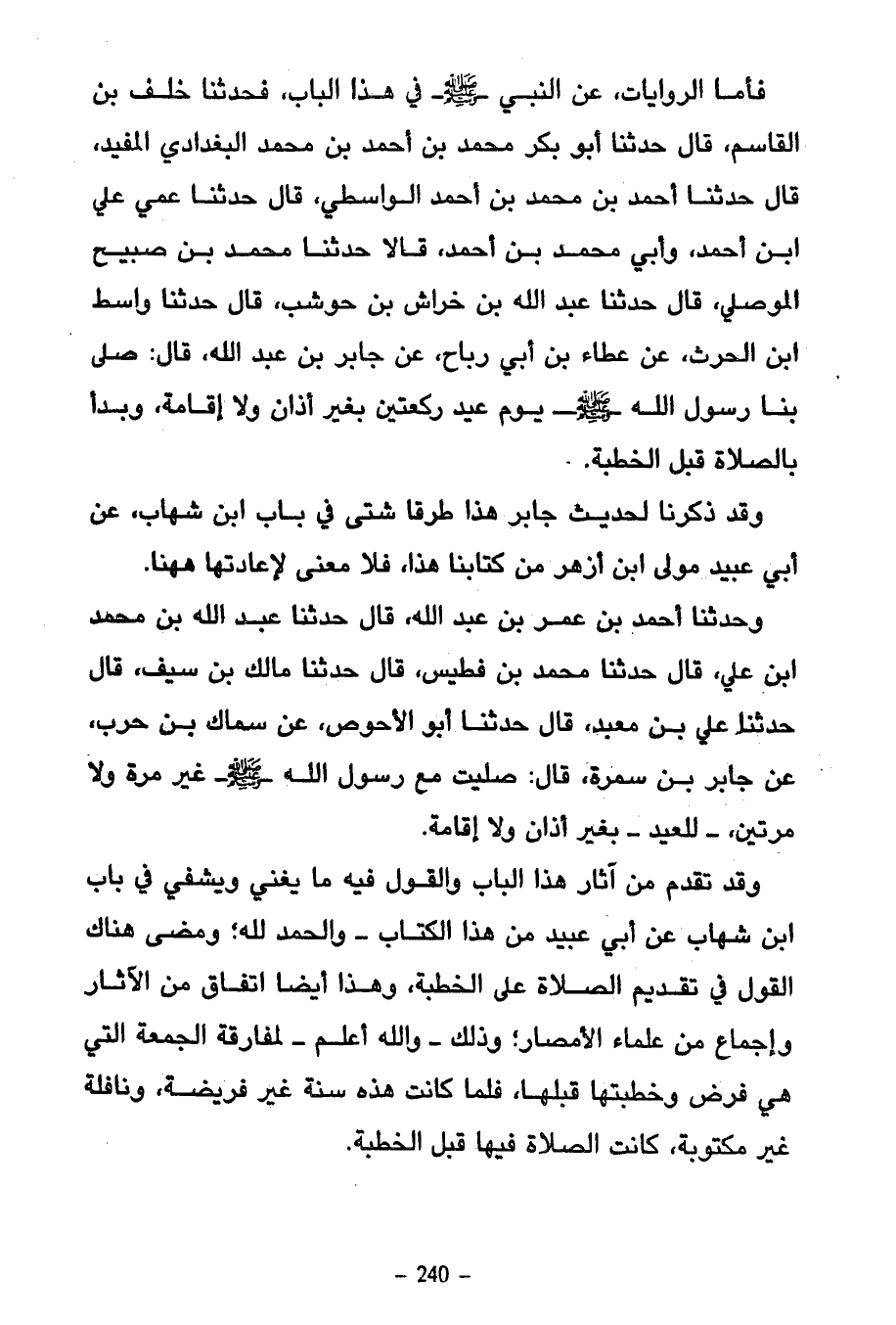 فَأَمَّا الرِّوَايَاتُ عَنِ النَّبِيِّ صَلَّى اللَّهُ عَلَيْهِ وَسَلَّمَ فِي هَذَا الْبَابِ فَحَدَّثَنَا خَلَفُ بْنُ الْقَاسِمِ قَالَ حَدَّثَنَا أَبُو بَكْرٍ مُحَمَّدُ بْنُ أَحْمَدَ بْنِ مُحَمَّدٍ الْبَغْدَادِيُّ الْمُفِيدُ قَالَ حَدَّثَنَا أَحْمَدُ بْنُ مُحَمَّدِ بْنِ أَحْمَدَ الْوَاسِطِيُّ قَالَ حدثنا عمي علي ابن أَحْمَدَ وَأَبِي مُحَمَّدِ بْنِ أَحْمَدَ قَالَا حَدَّثَنَا مُحَمَّدُ بْنُ صُبَيْحٍ الْمَوْصِلِيُّ قَالَ حَدَّثَنَا عَبْدُ اللَّهِ بْنُ خِرَاشِ بْنِ حَوْشَبٍ قَالَ حَدَّثَنَا واسط ابن الحرث عَنْ عَطَاءِ بْنِ أَبِي رَبَاحٍ عَنْ جَابِرِ بْنِ عَبْدِ اللَّهِ قَالَ صَلَّى بِنَا رَسُولُ اللَّهِ صَلَّى اللَّهُ عَلَيْهِ وَسَلَّمَ يَوْمَ عِيدٍ رَكْعَتَيْنِ بِغَيْرِ أَذَانٍ وَلَا إِقَامَةٍ وَبَدَأَ بِالصَّلَاةِ قَبْلَ الْخُطْبَةِ