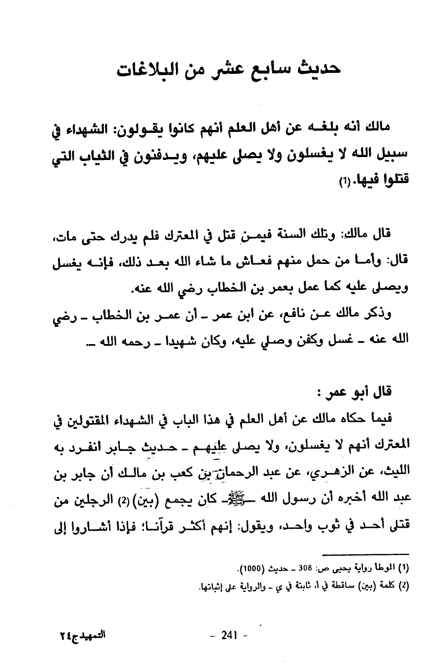 213737 37 -) قَالَ أَبُو عُمَرَ فِيمَا حَكَاهُ مَالِكٌ عَنْ أَهْلِ الْعِلْمِ فِي هَذَا الْبَابِ فِي الشُّهَدَاءِ الْمَقْتُولِينَ فِي الْمُعْتَرَكِ أَنَّهُمْ لَا يُغَسَّلُونَ وَلَا يُصَلَّى عَلَيْهِمْ حَدِيثُ جَابِرٍ انْفَرَدَ بِهِ اللَّيْثُ عَنِ الزُّهْرِيِّ عَنْ عَبْدِ الرَّحْمَنِ بْنِ كَعْبِ بْنِ مَالِكٍ أَنَّ جَابِرَ بْنَ عَبْدِ اللَّهِ أَخْبَرَهُ أَنَّ رَسُولَ اللَّهِ صَلَّى اللَّهُ عَلَيْهِ وسلم كَانَ يَجْمَعُ بَيْنَ الرَّجُلَيْنِ مِنْ قَتْلَى أُحُدٍ في ثوب واحد ويقول إنهم أَكْثَرُ قُرْآنًا فَإِذَا أَشَارُوا إِلَى