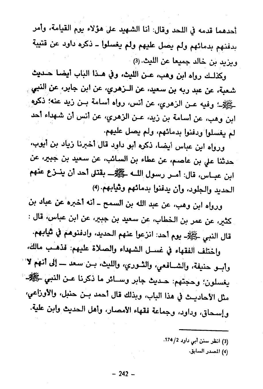 وَاخْتَلَفَ الْفُقَهَاءُ فِي غَسْلِ الشُّهَدَاءِ وَالصَّلَاةِ عَلَيْهِمْ فَذَهَبَ مَالِكٌ وَأَبُو حَنِيفَةَ وَالشَّافِعِيُّ وَالثَّوْرِيُّ وَاللَّيْثُ بْنُ سَعْدٍ إِلَى أَنَّهُمْ لَا يُغَسَّلُونَ وَحُجَّتُهُمْ حَدِيثُ جَابِرٍ وَسَائِرُ مَا ذَكَرْنَا عَنِ النَّبِيِّ صَلَّى اللَّهُ عَلَيْهِ وَسَلَّمَ مِثْلَ الْأَحَادِيثِ فِي هَذَا الْبَابِ وَبِذَلِكَ قَالَ أَحْمَدُ بْنُ حَنْبَلٍ وَالْأَوْزَاعِيُّ وَإِسْحَاقُ وَدَاوُدُ وَجَمَاعَةُ فُقَهَاءِ الْأَمْصَارِ وَأَهْلُ الْحَدِيثِ وَابْنُ علية