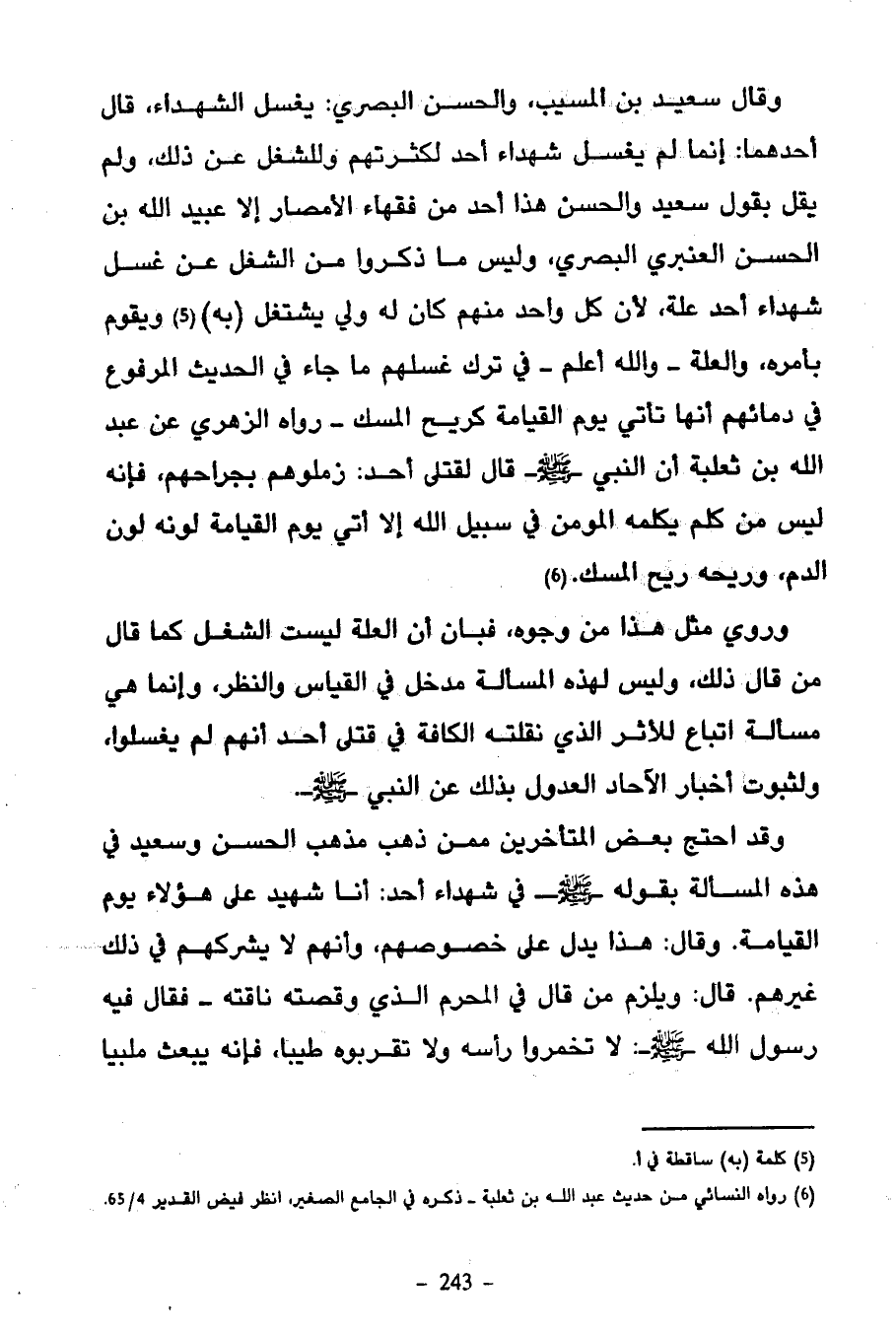 وَقَالَ سَعِيدُ بْنُ الْمُسَيَّبِ وَالْحَسَنُ الْبَصْرِيُّ يُغَسَّلُ الشُّهَدَاءُ قَالَ أَحَدُهُمَا إِنَّمَا لَمْ يُغَسَّلْ شُهَدَاءُ أُحُدٍ لِكَثْرَتِهِمْ وَلِلشُّغْلِ عَنْ ذَلِكَ وَلَمْ يَقُلْ بِقَوْلِ سَعِيدٍ وَالْحَسَنِ هَذَا أَحَدٌ مِنْ فُقَهَاءِ الْأَمْصَارِ إِلَّا عُبَيْدُ اللَّهِ بْنُ الْحَسَنِ الْعَنْبَرِيُّ الْبَصْرِيُّ وَلَيْسَ مَا ذَكَرُوا مِنَ الشُّغْلِ عَنْ غَسْلِ شُهَدَاءِ أُحُدٍ عِلَّةٌ لِأَنَّ كُلَّ وَاحِدٍ مِنْهُمْ كَانَ لَهُ وَلِيٌّ يَشْتَغِلُ بِهِ وَيَقُومُ بِأَمْرِهِ وَالْعِلَّةُ وَاللَّهُ أَعْلَمُ فِي تَرْكِ غُسْلِهِمْ مَا جَاءَ فِي الْحَدِيثِ الْمَرْفُوعِ فِي دِمَائِهِمْ أَنَّهَا تَأْتِي يَوْمَ الْقِيَامَةِ كَرِيحِ الْمِسْكِ رَوَاهُ الزُّهْرِيُّ عَنْ عَبْدِ اللَّهِ بْنِ ثَعْلَبَةَ أَنَّ النَّبِيَّ صَلَّى اللَّهُ عَلَيْهِ وَسَلَّمَ قَالَ لِقَتْلَى أُحُدٍ زَمِّلُوهُمْ بِجِرَاحِهِمْ فَإِنَّهُ لَيْسَ مِنْ كَلْمٍ يكلمه المؤمن فِي سَبِيلِ اللَّهِ إِلَّا أَتَى يَوْمَ الْقِيَامَةِ لَوْنُهُ لَوْنُ الدَّمِ وَرِيحُهُ رِيحُ الْمِسْكِ