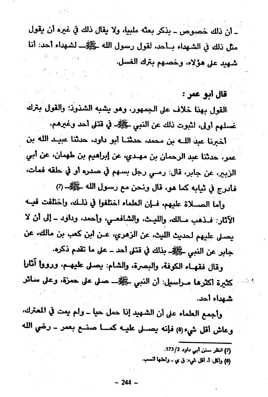 وَقَالَ فُقَهَاءُ الْكُوفَةِ وَالْبَصْرَةِ وَالشَّامِ يُصَلَّى عَلَيْهِمْ وَرَوَوْا آثَارًا كَثِيرَةً أَكْثَرُهُمْ مَرَاسِيلُ أَنَّ النَّبِيَّ صَلَّى اللَّهُ عَلَيْهِ وَسَلَّمَ صَلَّى عَلَى حَمْزَةَ وَعَلَى سَائِرِ شُهَدَاءِ أُحُدٍ