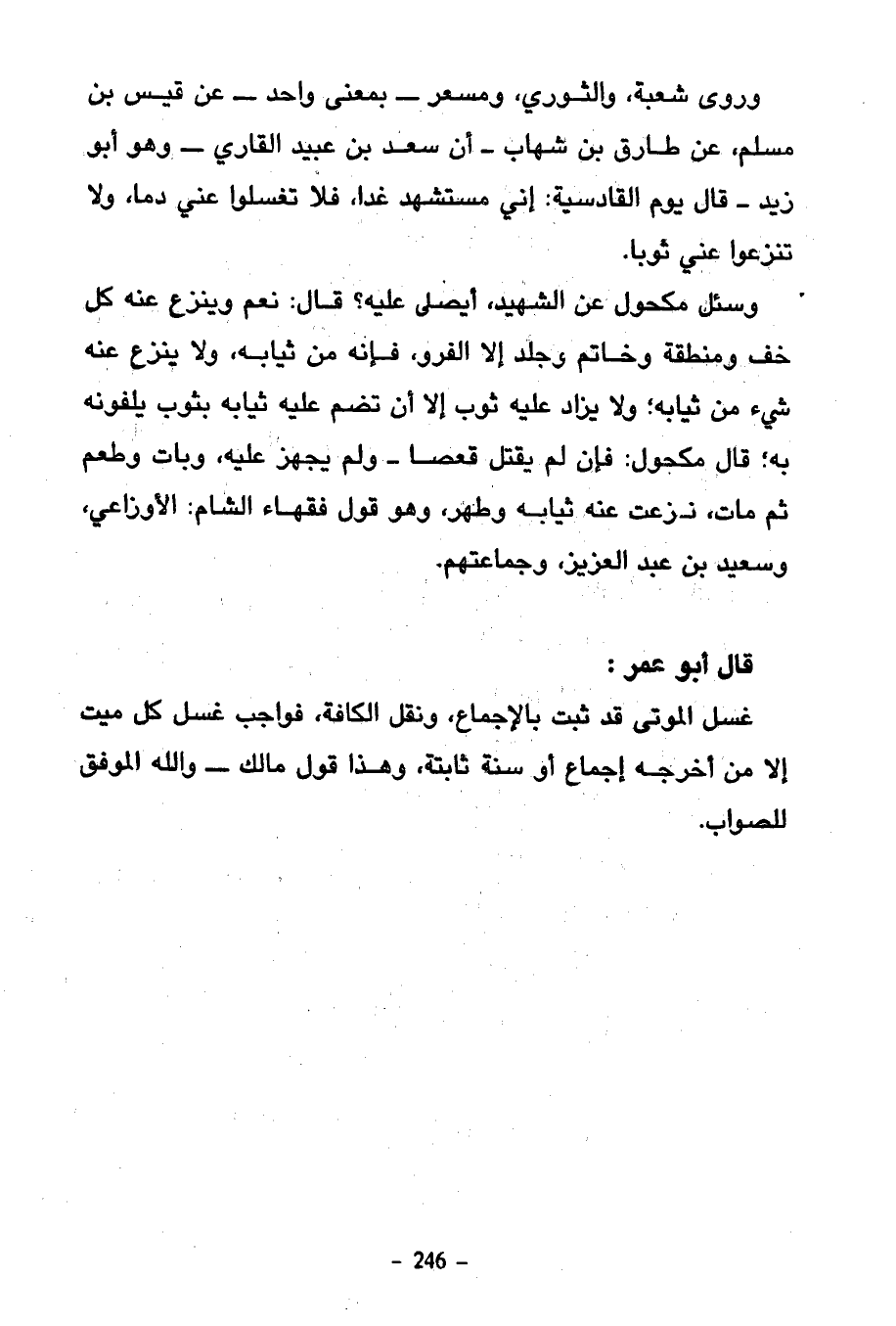 وَرَوَى شُعْبَةُ وَالثَّوْرِيُّ وَمَسْعَرٌ بِمَعْنًى وَاحِدٍ عَنْ قَيْسِ بْنِ مُسْلِمٍ عَنْ طَارِقِ بْنِ شِهَابٍ أَنَّ سَعْدَ بْنَ عُبَيْدٍ الْقَارِي وَهُوَ أَبُو زَيْدٍ قَالَ يَوْمَ الْقَادِسِيَّةِ إِنِّي مُسْتَشْهِدٌ غَدًا فَلَا تَغْسِلُوا عَنِّي دَمًا وَلَا تَنْزِعُوا عَنِّي ثَوْبًا