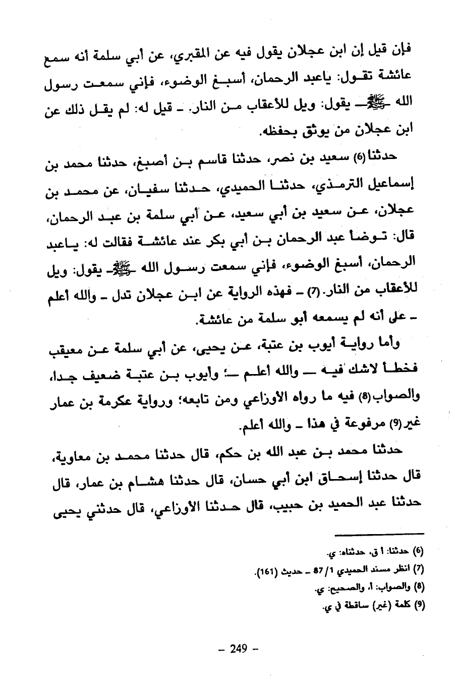 حَدَّثَنَا سَعِيدُ بْنُ نَصْرٍ حَدَّثَنَا قَاسِمُ بْنُ أَصْبَغَ حَدَّثَنَا مُحَمَّدُ بْنُ إِسْمَاعِيلَ التِّرْمِذِيُّ حَدَّثَنَا الْحُمَيْدِيُّ حَدَّثَنَا سُفْيَانُ عَنْ مُحَمَّدِ بْنِ عَجْلَانَ عَنِ سَعِيدِ بْنِ أَبِي سَعِيدٍ عَنْ أَبِي سَلَمَةَ بْنِ عَبْدِ الرَّحْمَنِ قَالَ تَوَضَّأَ عَبْدُ الرَّحْمَنِ بْنُ أَبِي بَكْرٍ عِنْدَ عَائِشَةَ فَقَالَتْ لَهُ يَا عَبْدَ الرَّحْمَنِ أَسْبِغِ الوضوء فإني سمعت رسول الله يَقُولُ وَيْلٌ لِلْأَعْقَابِ مِنَ النَّارِ