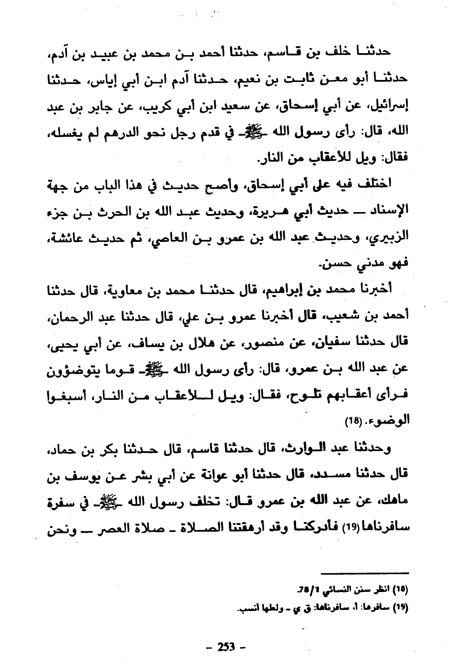 حَدَّثَنَا خَلَفُ بْنُ قَاسِمٍ حَدَّثَنَا أَحْمَدُ بْنُ مُحَمَّدِ بْنِ عُبَيْدِ بْنِ آدَمَ حَدَّثَنَا أَبُو مَعْنٍ ثَابِتُ بْنُ نُعَيْمٍ حَدَّثَنَا آدَمُ ابْنُ أَبِي إِيَاسٍ حَدَّثَنَا إِسْرَائِيلُ عَنْ أَبِي إِسْحَاقَ عَنْ سَعِيدِ ابْنِ أَبِي كُرَيْبٍ عَنْ جَابِرِ بْنِ عَبْدِ اللَّهِ قَالَ رَأَى رَسُولُ اللَّهِ فِي قَدَمِ رَجُلٍ نَحْوَ الدِّرْهَمِ لَمْ يَغْسِلْهُ فَقَالَ وَيْلٌ لِلْأَعْقَابِ مِنَ النَّارِ