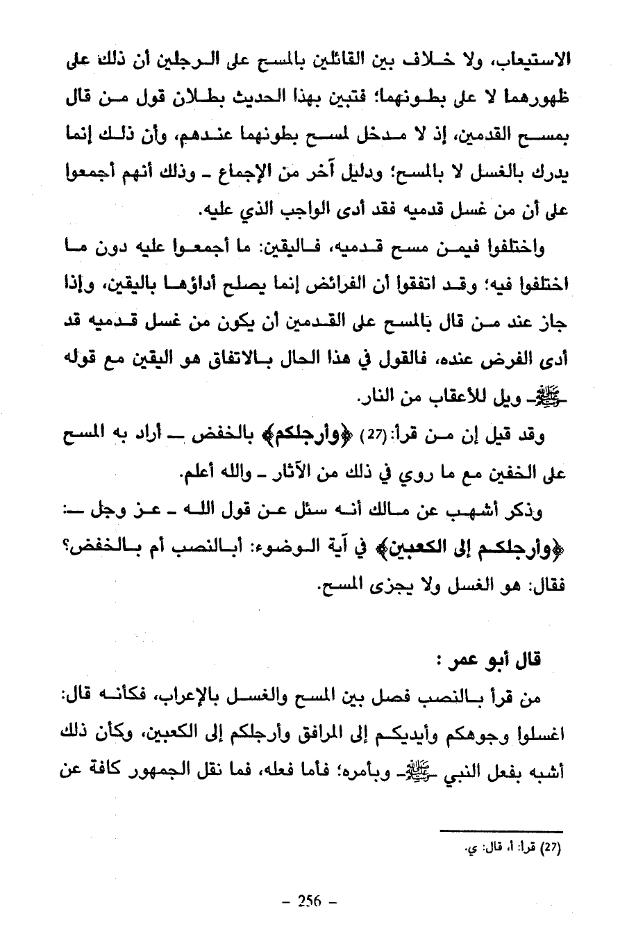 قَالَ أَبُو عُمَرَ مَنْ قَرَأَ بِالنَّصْبِ فَصَلَ بَيْنَ الْمَسْحِ وَالْغَسْلِ بِالْإِعْرَابِ فَكَأَنَّهُ قَالَ اغْسِلُوا وُجُوهَكُمْ وَأَيْدِيَكُمْ إِلَى الْمَرَافِقِ وَأَرْجُلَكُمْ إِلَى الْكَعْبَيْنِ وَكَأَنَّ ذَلِكَ أَشْبَهُ بِفِعْلِ النَّبِيِّ وَبِأَمْرِهِ فَأَمَّا فِعْلُهُ فَمَا نَقَلَ الْجُمْهُورُ كَافَّةً عن