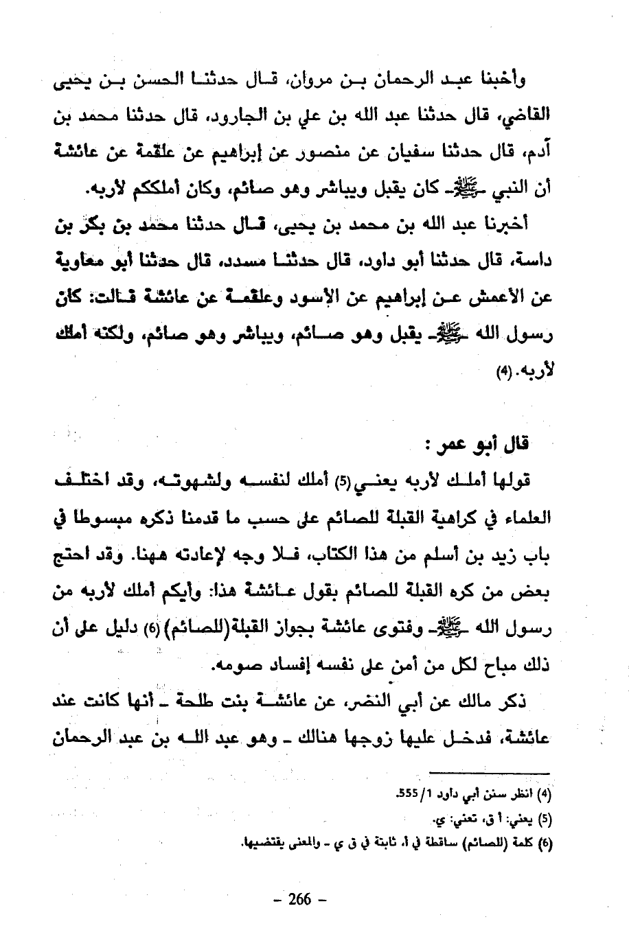 قَالَ أَبُو عُمَرَ قَوْلُهَا أَمْلَكَ لِإِرْبِهِ يَعْنِي أَمْلَكَ لِنَفْسِهِ وَلِشَهْوَتِهِ وَقَدِ اخْتَلَفَ الْعُلَمَاءُ فِي كَرَاهِيَةِ الْقُبْلَةِ لِلصَّائِمِ عَلَى حَسَبِ مَا قَدَّمْنَا ذِكْرَهُ مَبْسُوطًا فِي بَابِ زَيْدِ بْنِ أَسْلَمَ مِنْ هَذَا الْكِتَابِ فَلَا وَجْهَ لإعادته ههنا