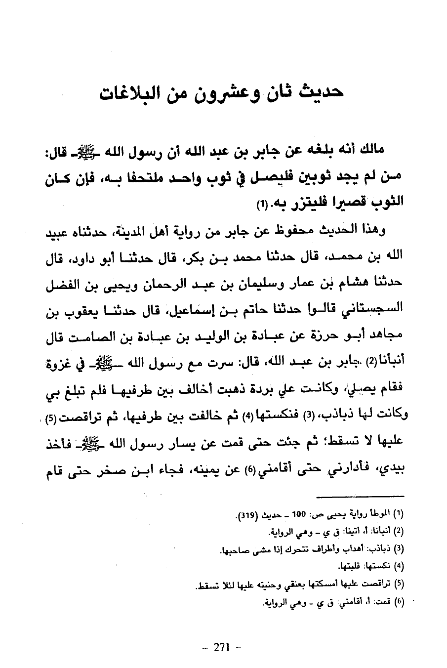 118 - مَالِكٌ أَنَّهُ بَلَغَهُ عَنْ جَابِرِ بْنِ عَبْدِ اللَّهِ أَنَّ رَسُولَ اللَّهِ صَلَّى اللَّهُ عَلَيْهِ وَسَلَّمَ قَالَ مَنْ لَمْ يَجِدْ ثَوْبَيْنِ فَلْيُصَلِّ فِي ثَوْبٍ وَاحِدٍ مُلْتَحِفًا بِهِ فَإِنْ كَانَ الثَّوْبُ قَصِيرًا فَلْيَتَّزِرْ بِهِ